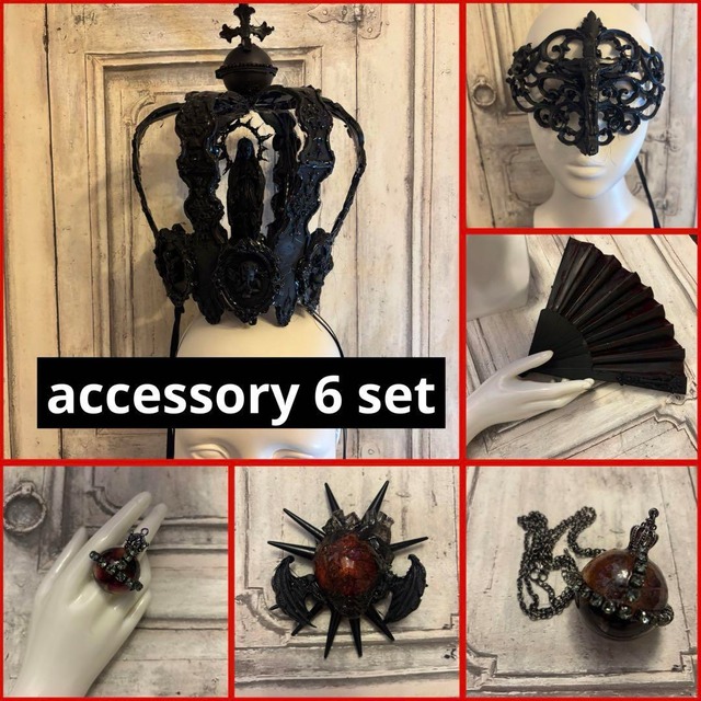 こちらはVIRTU MORE (ヴィルツ モア)1点限定アクセサリーセットになります。 ◈商品詳細◈ テーマに寄り添うように王冠 仮面 ネックレス リング ブローチ ファンなどアクセサリー6点セットになります。 大変お得なセットとなりますのでバラ売りは不可とさせていただいております。 ①王冠 人気のビックサイズ王冠ヘッドドレスです。中に聖母が祈りを捧げています。 ②仮面 繊細なアラベスク調ベースの仮面になります。 中央のキリストが印象的です。 ③血塗りの扇子 ブラックベースの扇子には血が滴り落ちそうな雰囲気です。 ④オーブリング バラの花弁を封じこめたリングです。スワロスキークリスタルの輝きが素敵です。 ⑤オーブネックレス 中にバラの花を封じ込めたオーブ型ネックレスです。 スワロスキークリスタル使用 ⑥ハートブローチ スモーキーな心臓の中にはバラの花が1輪封じ込まれています。 ○素材 樹脂 レンジなど ○装着方法 王冠、仮面、眼帯、チョーカーはリボンで装着 リングはサイズフリーリングでどなた様にも対応可能です。 ネックレスは首周り60cm+5cmアジャスター ◈size◈ 画像を参考にお願い致します。 お得なaccessoryセットです。 6点あるので個別に使用やトータル装着も素敵です。 ◈注意事項◈ 〇デザイン的に鋭利な部分が多々有りますので梱包開封時や取扱いにお怪我等なさらないようご注意下さい。 〇意図的にエイジング処理を施し荒く制作されています。 ○高温多湿、直射日光を避けディスプレイしてください。 〇梱包は基本的にリサイクル資材を使いますが丁寧に配送時に破損しないように心掛けて梱包致します。 ○作品はとてもデリケートです。特にパーツ数が多いものや接点の狭い物は配送時、梱包開封時に稀に外れる場合があります。 ご自身で修復して頂ける方のみ購入を宜しくお願い致します。 なお致命的な破損時は事務局にお問い合わせ下さい。