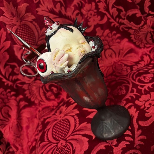 こちらの作品は、「忘れられた古い製菓店」の奥底に捧げられた、甘美で残酷な装飾パフェ・オブジェです。 VIRTU MORE(ヴィルツ モア)が提示する、砂糖菓子のように儚く、毒のように鮮烈な退廃美を形にしました。 • 悪夢のトッピング: 滴り落ちる黒い蜜(シロップ)が絡まるドールヘッドのバニラ。その傍らには、こちらを凝視する剥き出しの眼球と、血に染まったハサミが添えられています。 • 装飾のコントラスト: シックな黒のグラスに、異形のパーツと鮮やかな赤が映える、シュルレアリスム的な美学を凝縮しました。 • 錬金術的アプローチ: かつて甘い喜びであったパフェが、時を経て呪物のような美しさを纏った姿。観る者の視覚と深層心理を刺激する一点物のオブジェです。 【商品詳細】 • ブランド: VIRTU MORE(ヴィルツ モア) • サイズ: • 高さ:約20cm • 幅:約10cm • 仕様: 縦長のシルエットで、限られたスペースでも独特の存在感を放つ据え置き型オブジェです。 • 状態: 長い年月、誰にも見られず熟成されたようなアンティーク・ダメージ加工を施しています。 #VIRTUMORE #デカダンス #退廃 #ゴシック #アンティーク #フェイクスイーツ #ドールヘッド #ダークメルヘン #忘れられた製菓店 #死生観 #シュルレアリスム #一点物 #ハンドメイド
