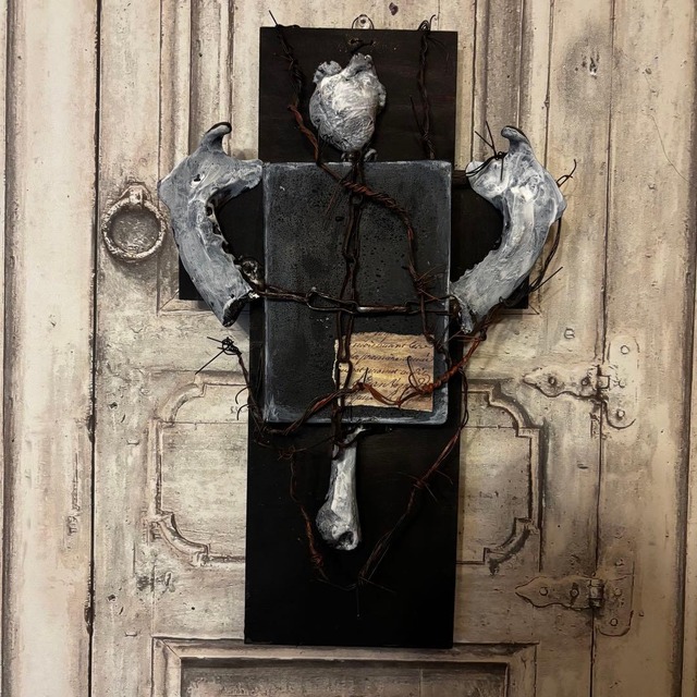 こちらはVIRTU MORE (ヴィルツ モア)1点限定オブジェクトになります。 ◈商品詳細◈ 「死」と「信仰」の境界線をテーマに制作した、唯一無二のダーク・レリック(聖遺物)オブジェです。 大型のボーンを十字(クロス)に組み上げ、鋭利な有刺鉄線で幾重にも縛り上げたその姿は、ある種の**「受難」**を想起させます。漆黒のウッドベースが、白濁した骨の質感を鮮烈に浮かび上がらせる、重厚な一点物のアートピースです。 • サイズ: 縦 約37cm × 横 約21cm • 仕様: 壁掛け用金具装着済み。 • 加工: 経年劣化を再現した多層レイヤード塗装、エイジング・ウェザリング加工。 ◈注意事項◈ 〇デザイン的に鋭利な部分が多々有りますので梱包開封時や取扱いにお怪我等なさらないようご注意下さい。 〇意図的にエイジング処理を施し荒く制作されています。 ○高温多湿、直射日光を避けディスプレイしてください。 〇梱包は基本的にリサイクル資材を使いますが丁寧に配送時に破損しないように心掛けて梱包致します。 ○作品はとてもデリケートです。特にパーツ数が多いものや接点の狭い物は配送時、梱包開封時に稀に外れる場合があります。 ご自身で修復して頂ける方のみ購入を宜しくお願い致します。 なお致命的な破損時は事務局にお問い合わせ下さい。