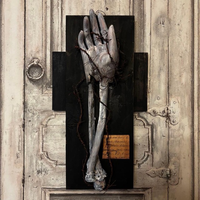 こちらはVIRTU MORE (ヴィルツ モア)1点限定オブジェクトになります。 ◈商品詳細◈ 静寂と退廃をテーマに制作した、コンセプチュアルなウォールアートです。 白骨化した「手」が、黒く煤けた十字の木製ベースに、錆びた鉄鎖と有刺鉄線によって封じ込められた「沈黙の祈り」を表現しています。単なる装飾品ではなく、そこにある種の「物語」を感じさせる重厚な佇まいを目指しました。 • Size: 全高 約37cm × 全幅 約21cm • Mount: 背面壁掛け仕様。 • Finish: 特殊汚し加工、エイジング塗装済み。 ◈注意事項◈ 〇デザイン的に鋭利な部分が多々有りますので梱包開封時や取扱いにお怪我等なさらないようご注意下さい。 〇意図的にエイジング処理を施し荒く制作されています。 ○高温多湿、直射日光を避けディスプレイしてください。 〇梱包は基本的にリサイクル資材を使いますが丁寧に配送時に破損しないように心掛けて梱包致します。 ○作品はとてもデリケートです。特にパーツ数が多いものや接点の狭い物は配送時、梱包開封時に稀に外れる場合があります。 ご自身で修復して頂ける方のみ購入を宜しくお願い致します。 なお致命的な破損時は事務局にお問い合わせ下さい。