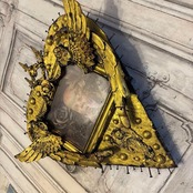 目を奪われるほどの装飾が施された、心臓の形をしたアンティーク調のフレームです。全体を覆うゴールドの輝きは、長年を経たような深みと陰影を持ち、独特の存在感を放ちます。
