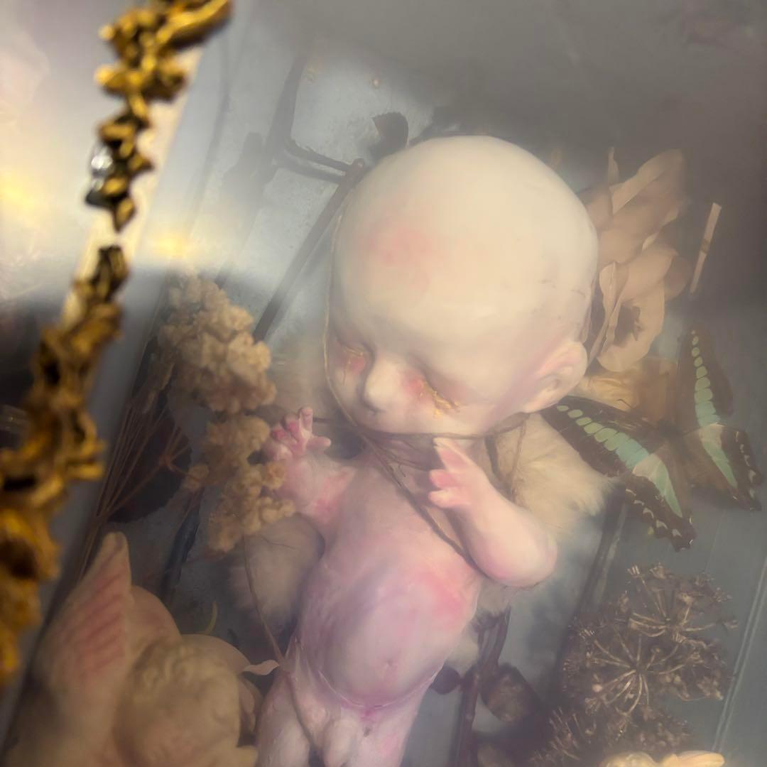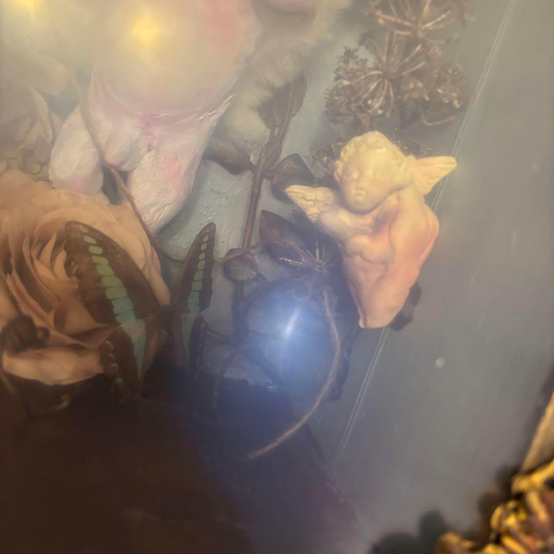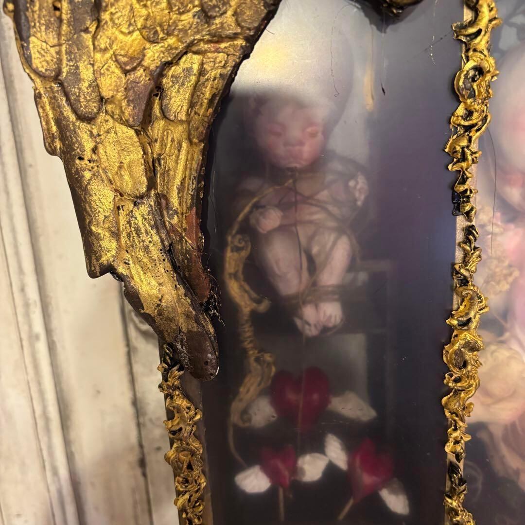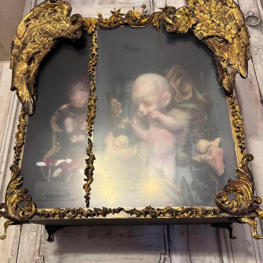 アンティーク風エイジング加工を施したロココ調BOXの中には愛と調和を司る天使ハニエルと相棒が時を止められふとした事で、動き出しそうな雰囲気で佇むBOX型オブジェになります。