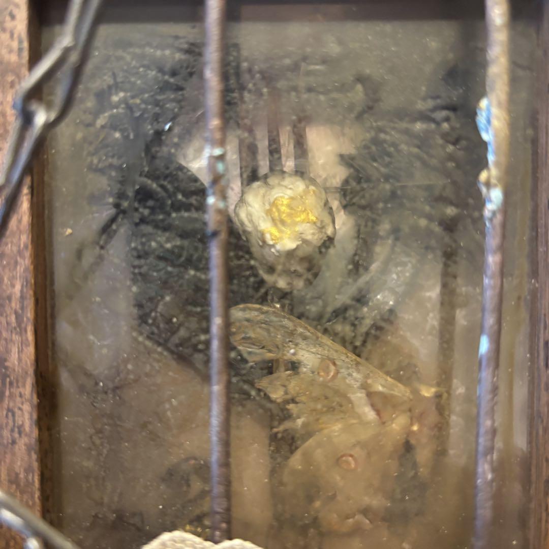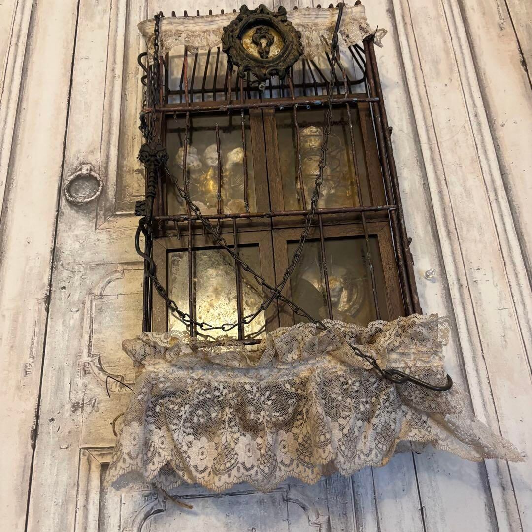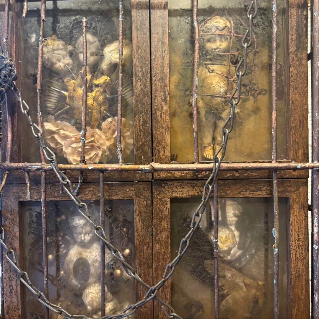 錆び付いた金属製檻の中には翼を蝕食されしもの達が4つのパーティーションに分類され幽閉されたアッサンブラージュ作品になります。
