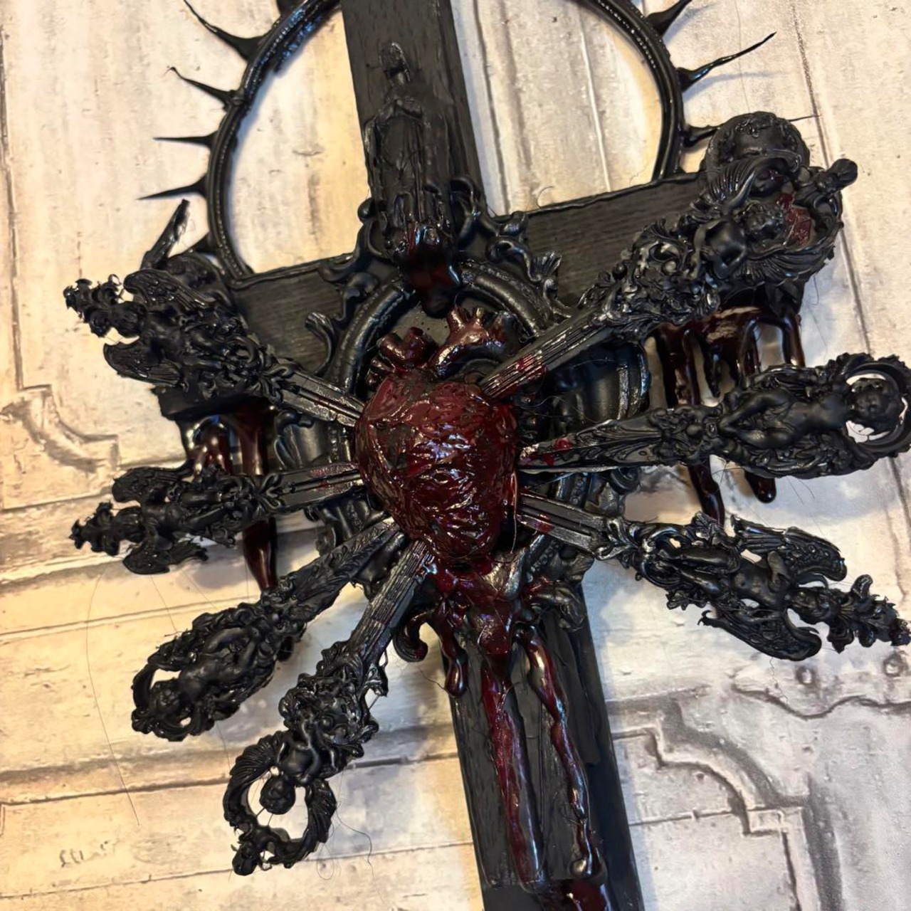 漆黒の十字架をベースに闇聖母心臓をイメージして制作された壁掛けオブジェと類似するモチーフネックレスのセットになります。