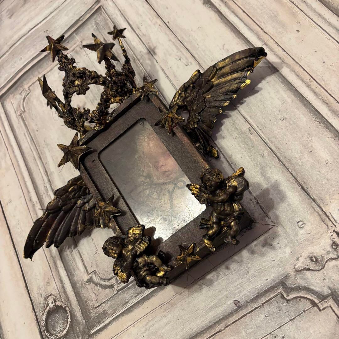 この作品は、幼い天使の肖像画を王冠や星といったモチーフで装飾した、神秘的で可愛らしい作品です。