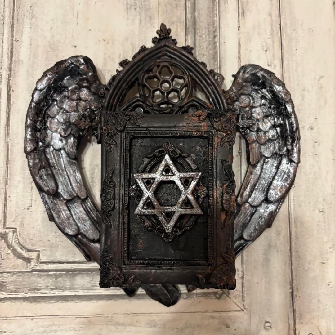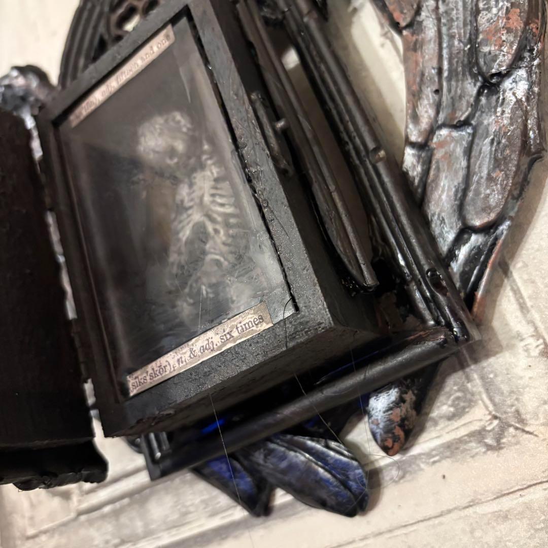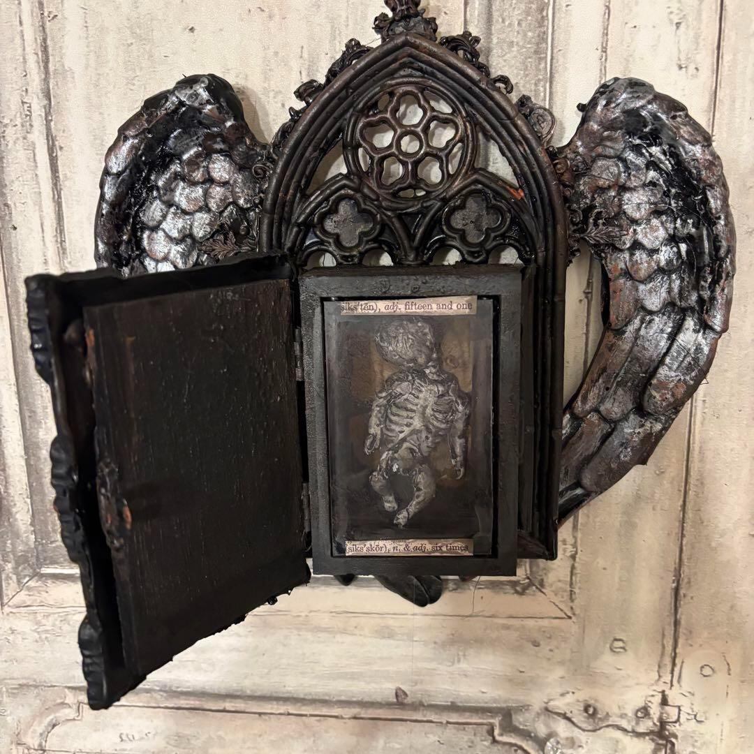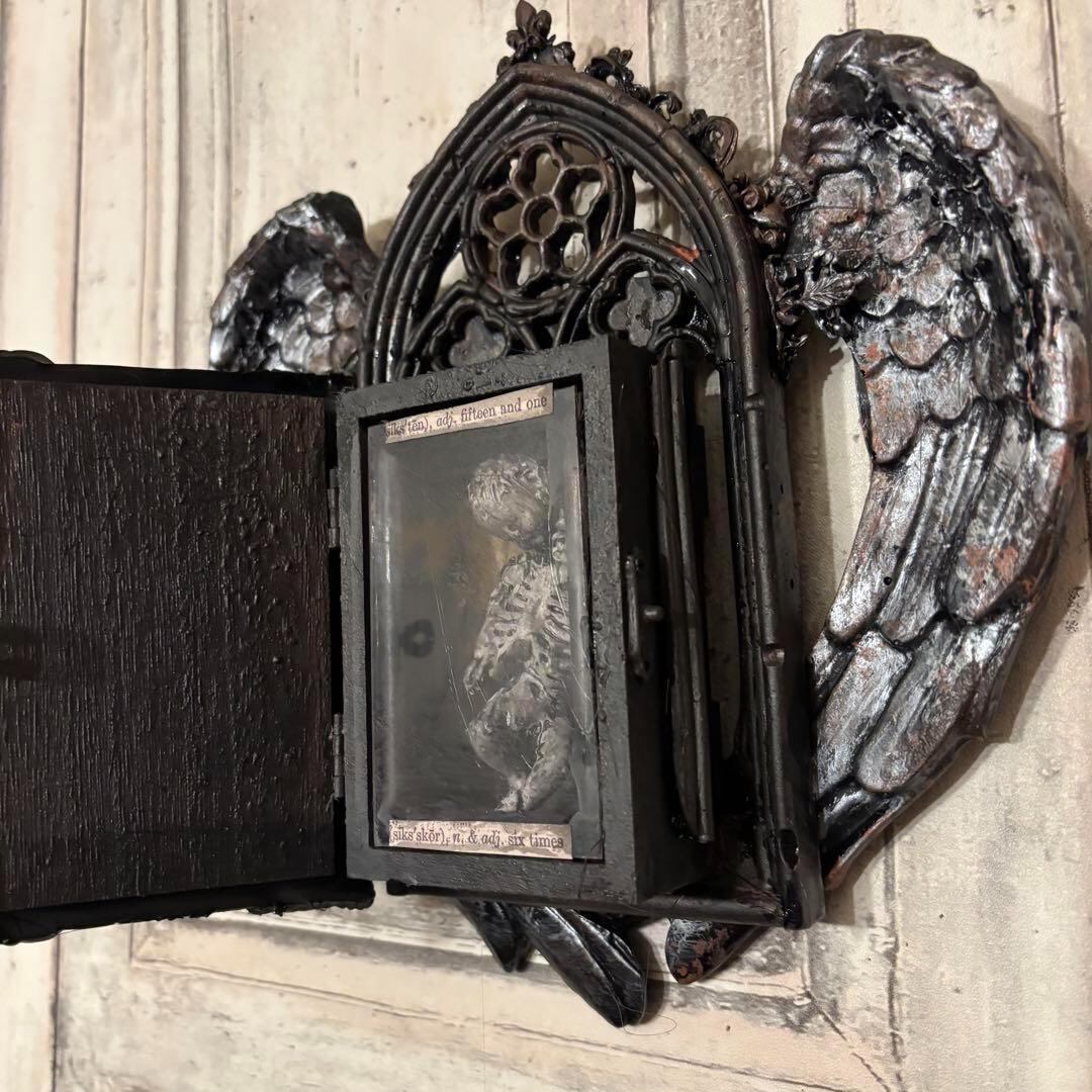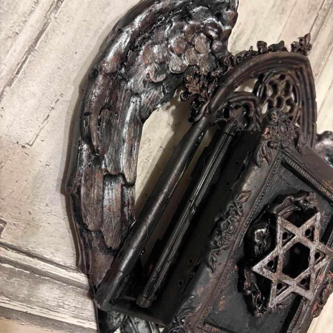 古びた木製の枠に、天使の羽が寄り添うように配置されたこの作品は、どこか懐かしい温もりと同時に、死と再生を象徴する神秘的な雰囲気を醸し出しています。