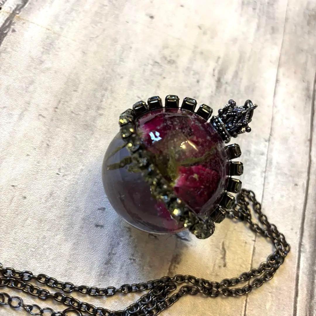 深紅に色褪せた薔薇の花びらが、透明な球体の中に封じ込められ、まるで時が止まったかのような幻想的な小宇宙を形成しています。その球体の周囲には、ダークな輝きを放つストーンが贅沢に配され、さらに頂点には精巧な王冠のモチーフが鎮座。これは、失われた王国の秘宝、あるいは禁断の儀式に用いられた宝玉を思わせます。