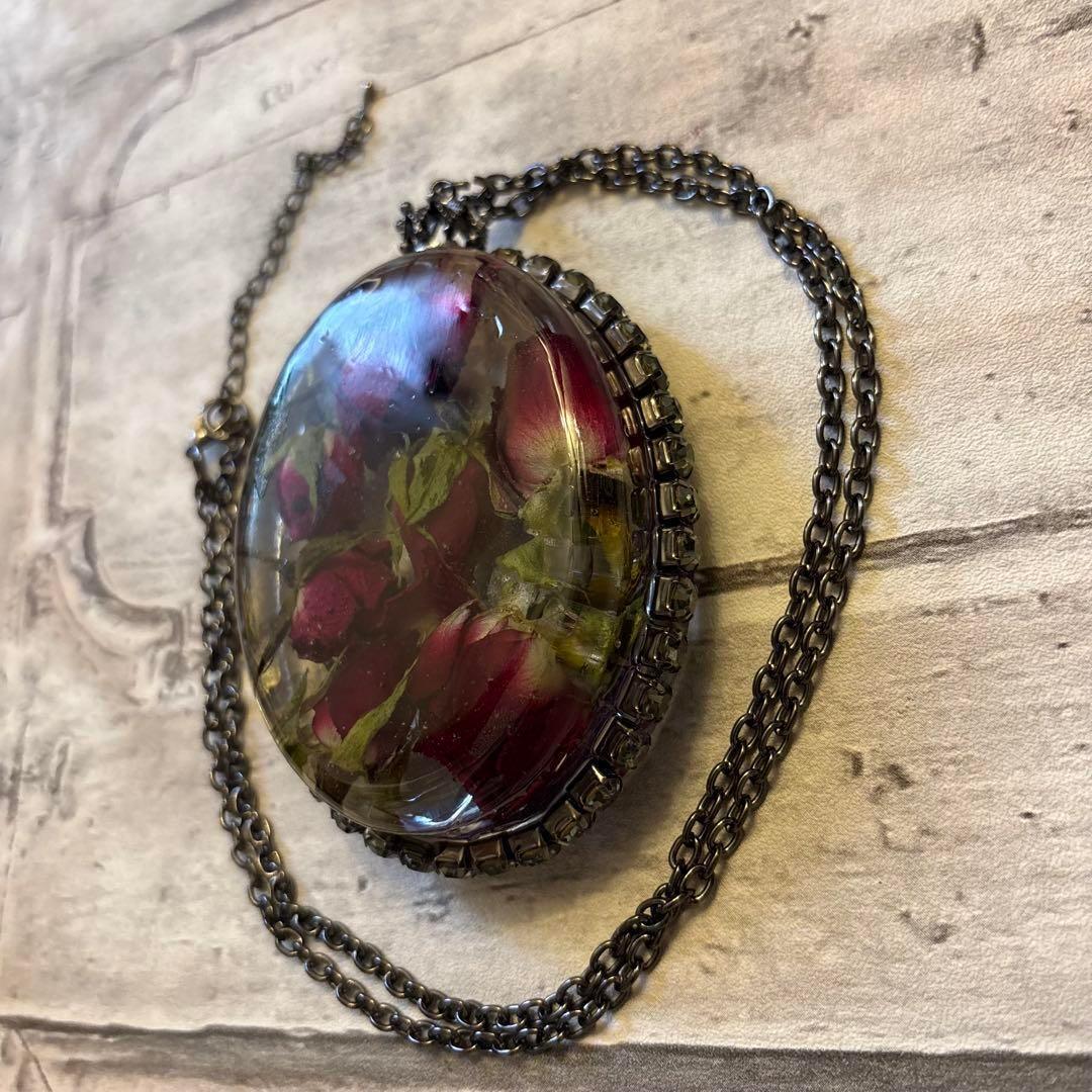アンティーク調のダークトーンのフレームに収められたオーバル型のレジンの中には、幾つもの深紅の薔薇の蕾や花びらが、朽ちることなく鮮やかに封じ込められています。まるで、過ぎ去りし時代のロマンスや、忘れ去られた記憶が閉じ込められたかのような、詩的な情景を紡ぎ出します。その頂には、小さな王冠のモチーフが飾られ、気品と歴史を感じさせます。