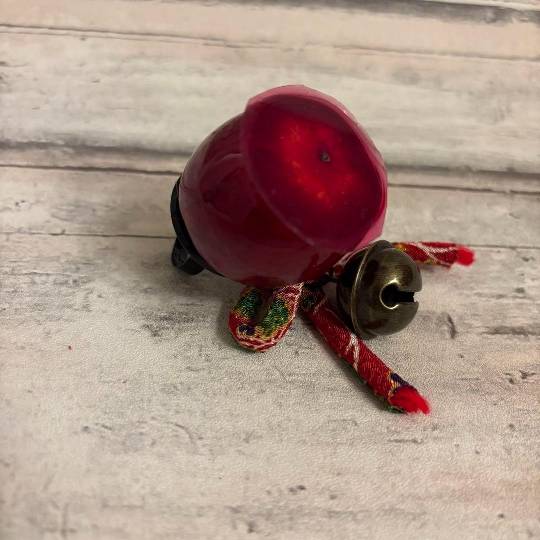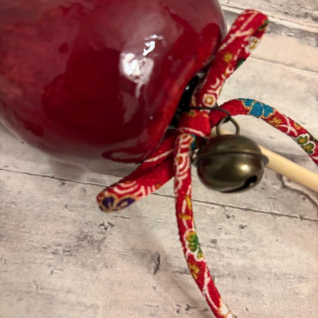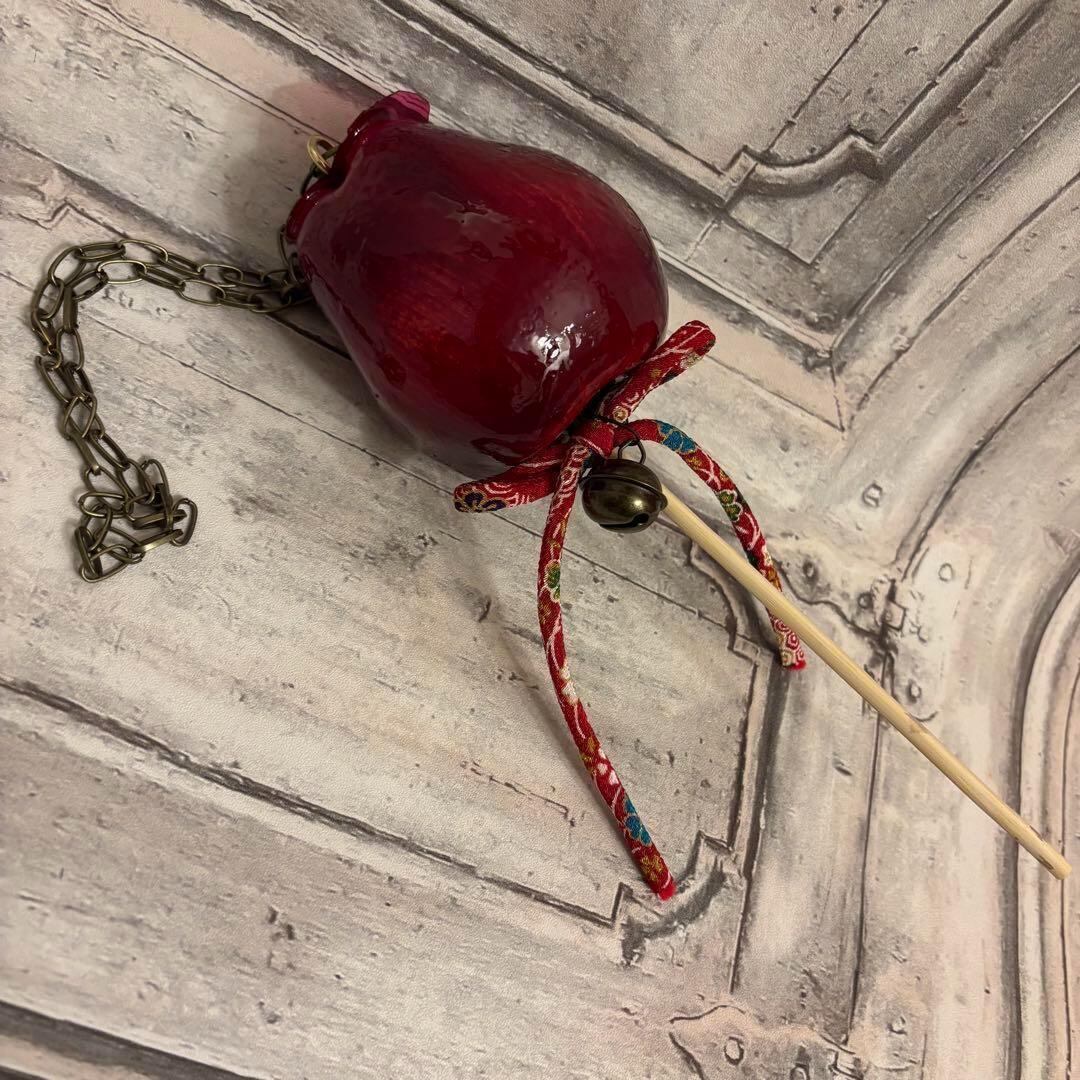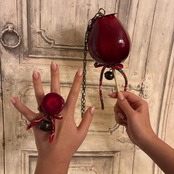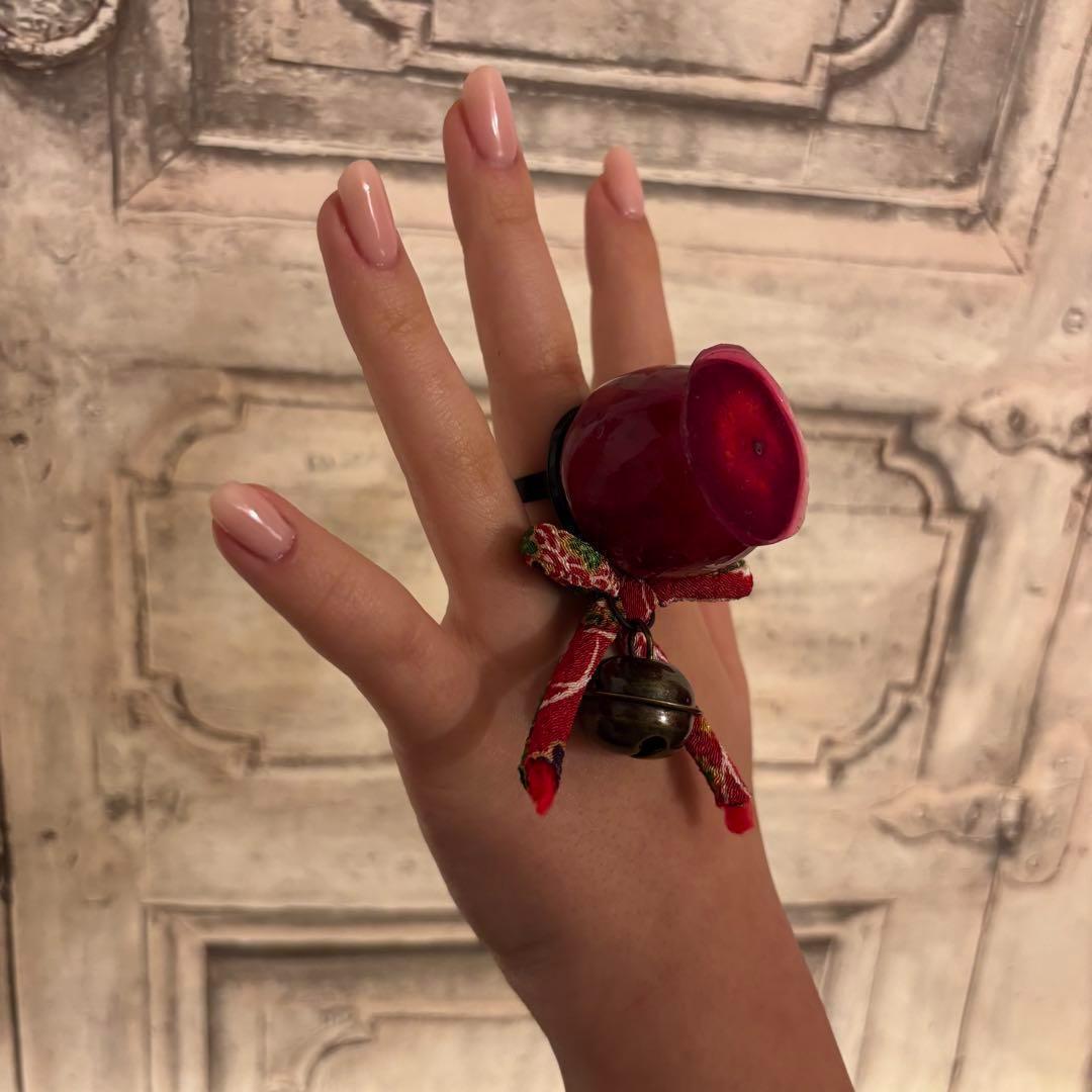 艶やかな赤色が美しい、和風ゴシックテイストのりんご飴モチーフアクセサリーセットです。本物のりんご飴のような立体感と、鈴の音が特徴。リングとネックレスの2点セットです。