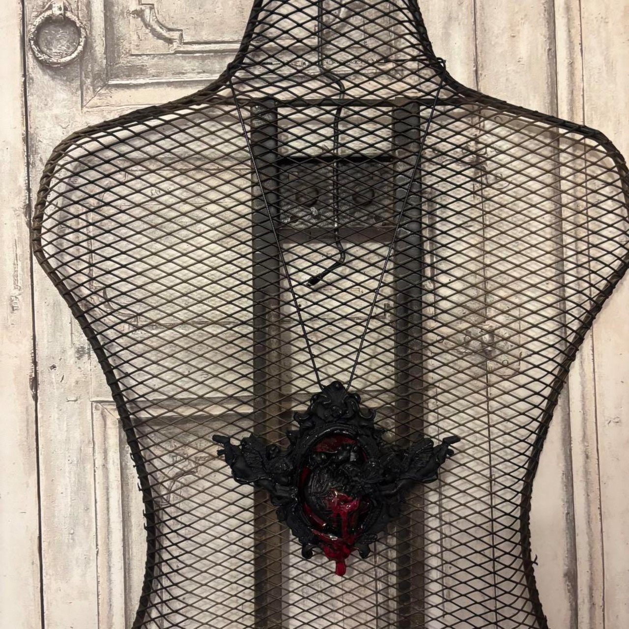 心臓に杭が刺さり血を流すリアルな雰囲気のネックレスになります。