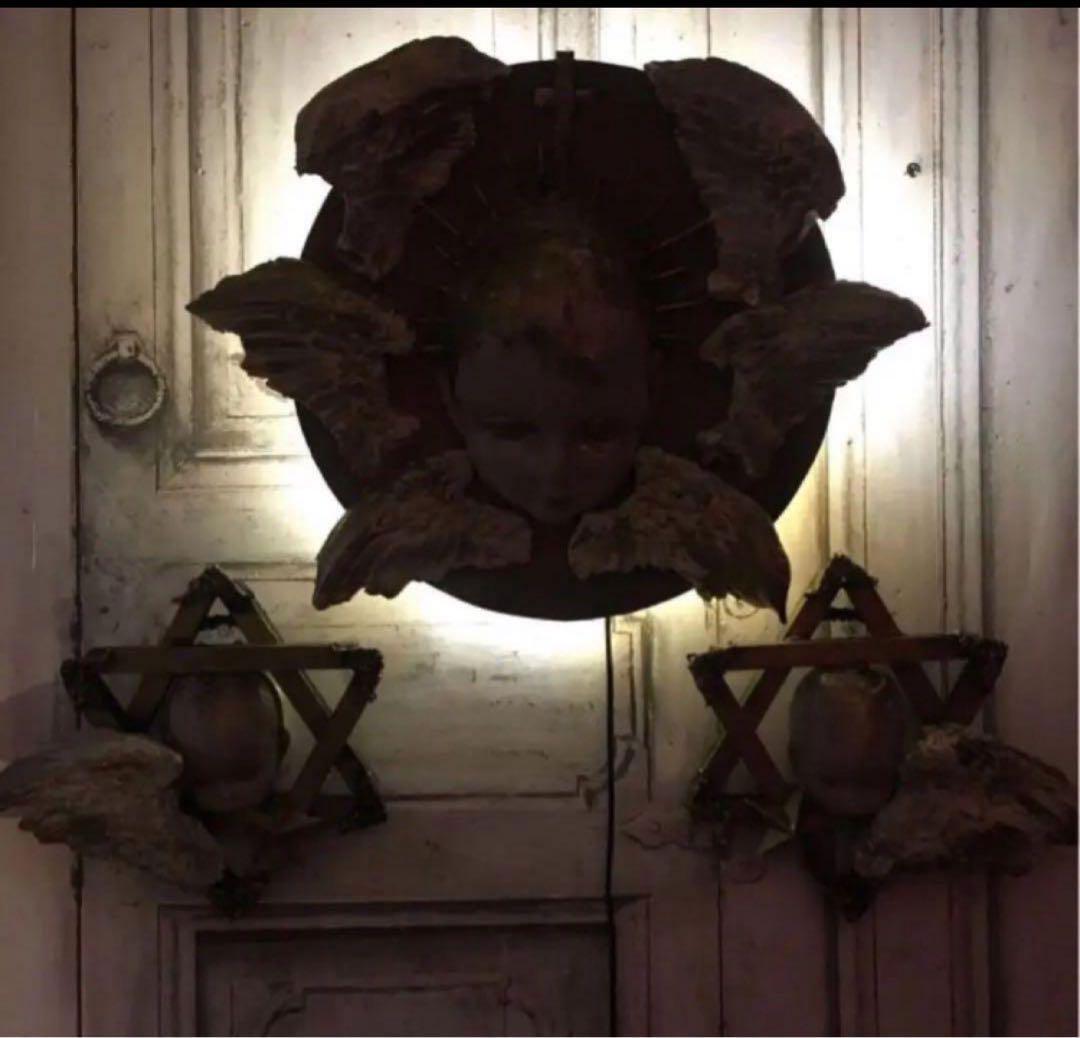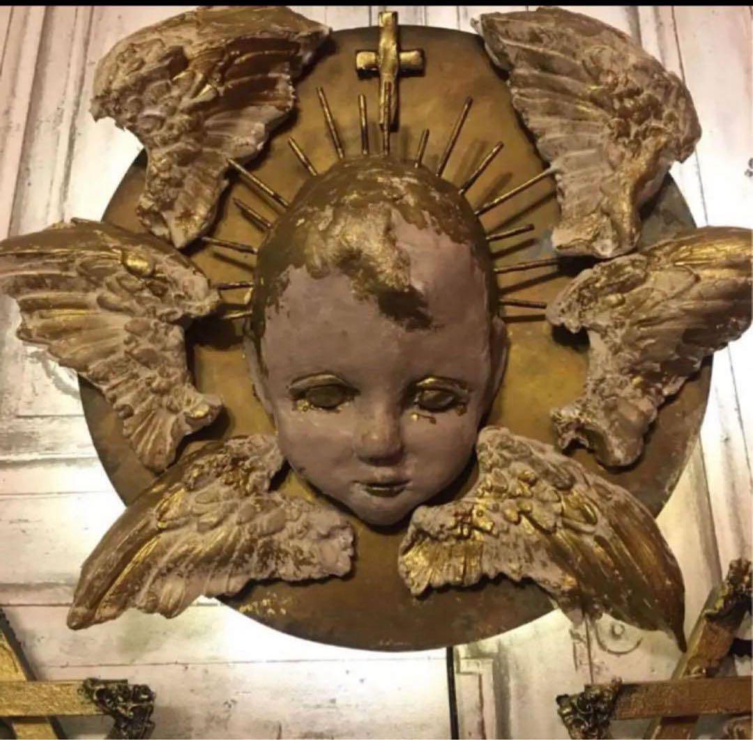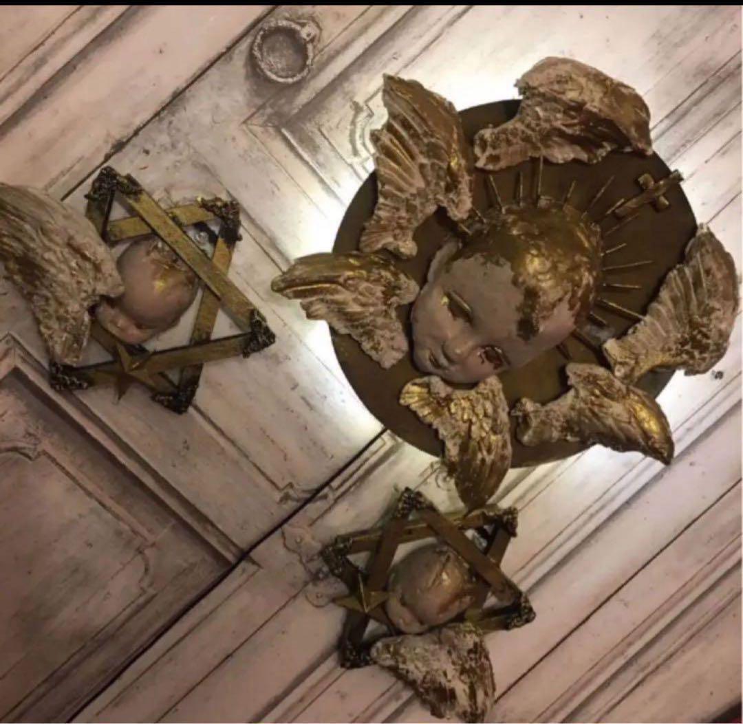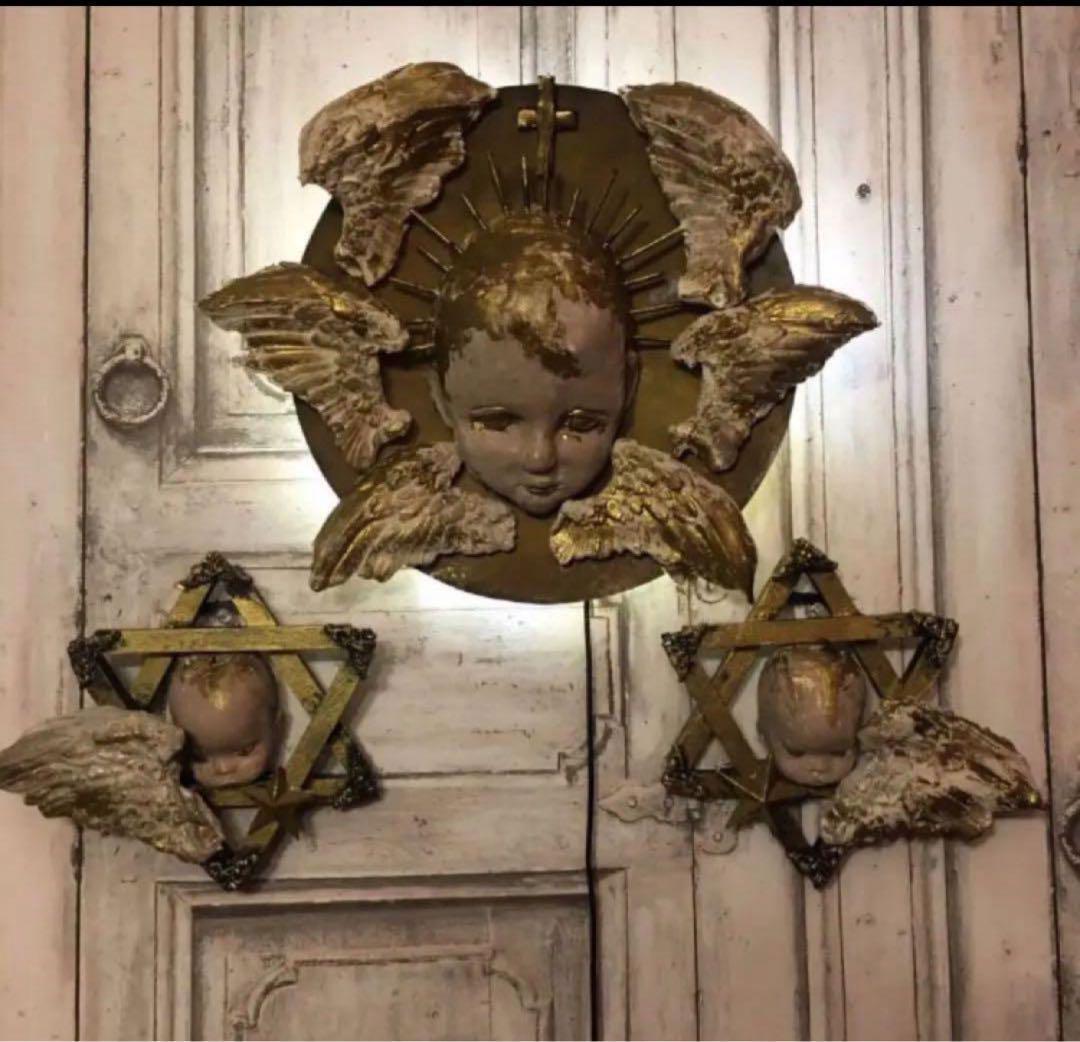 子供用アンティーク手持シンバルを基礎に裏面に柔らかい天使の後光をイメージしたUSBコンセント式ライトが付いた壁掛けオブジェになります。一対の守護天使セットです。