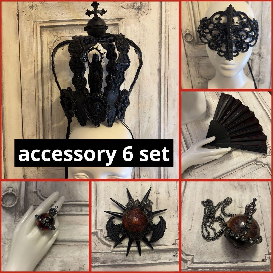 テーマに寄り添うように王冠 仮面 ネックレス リング ブローチ ファンなどアクセサリー6点セットになります。