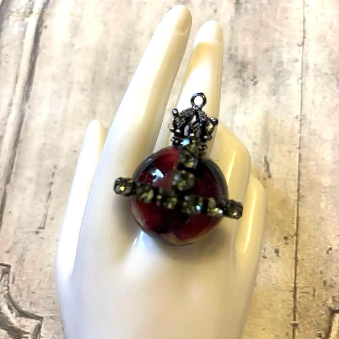 深紅に色褪せた薔薇の花びらが、透明な球体の中に封じ込められ、まるで時が止まったかのような幻想的な小宇宙を形成しています。その球体の周囲には、ダークな輝きを放つストーンが贅沢に配され、さらに頂点には精巧な王冠のモチーフが鎮座。これは、失われた王国の秘宝、あるいは禁断の儀式に用いられた宝玉を思わせます。