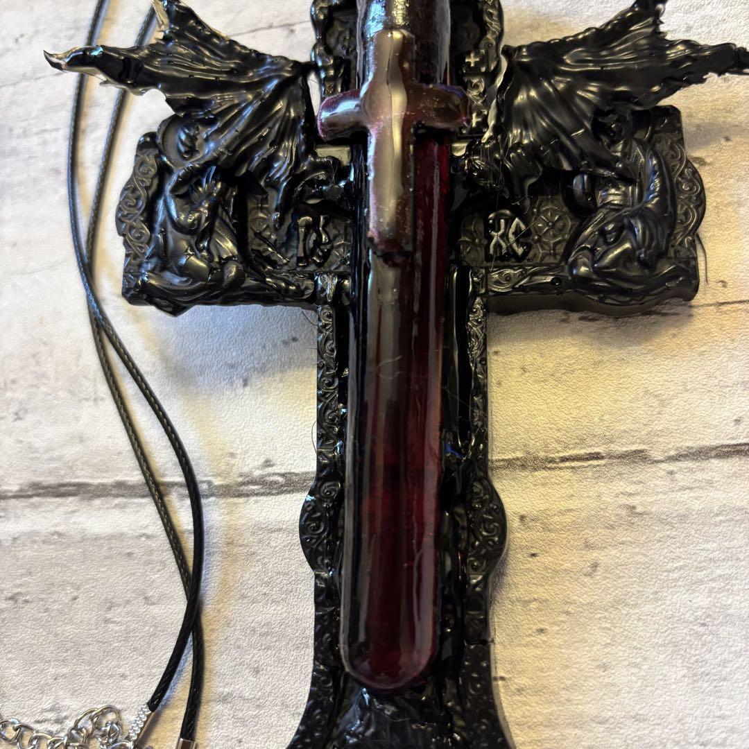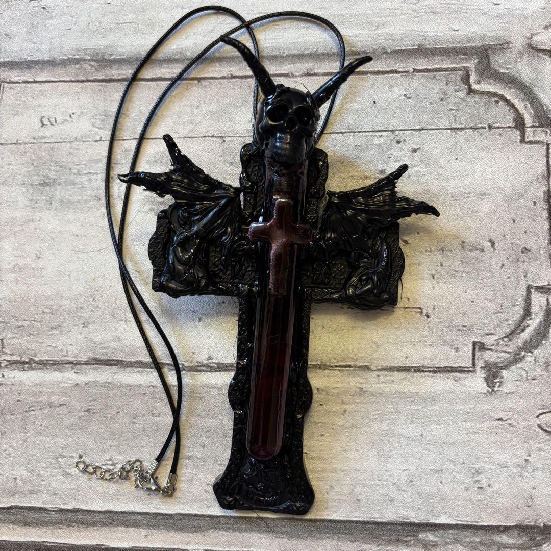 中央には、深いワインレッドの液体が妖しく揺らめく試験管が配され、その中には小さな十字架が静かに佇んでいます。まるで古の秘術によって封じ込められたかのような神秘的な存在感を放ち、身につける者の個性を際立たせます。