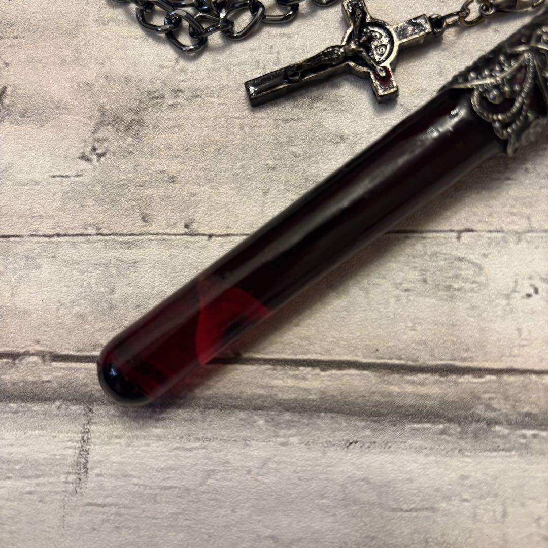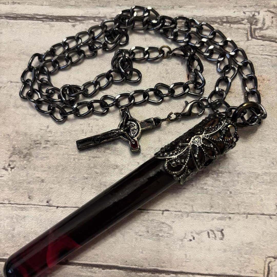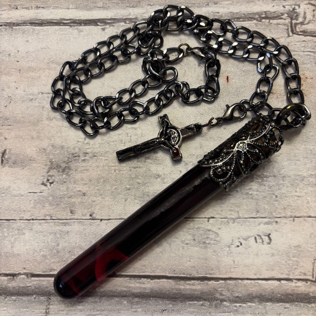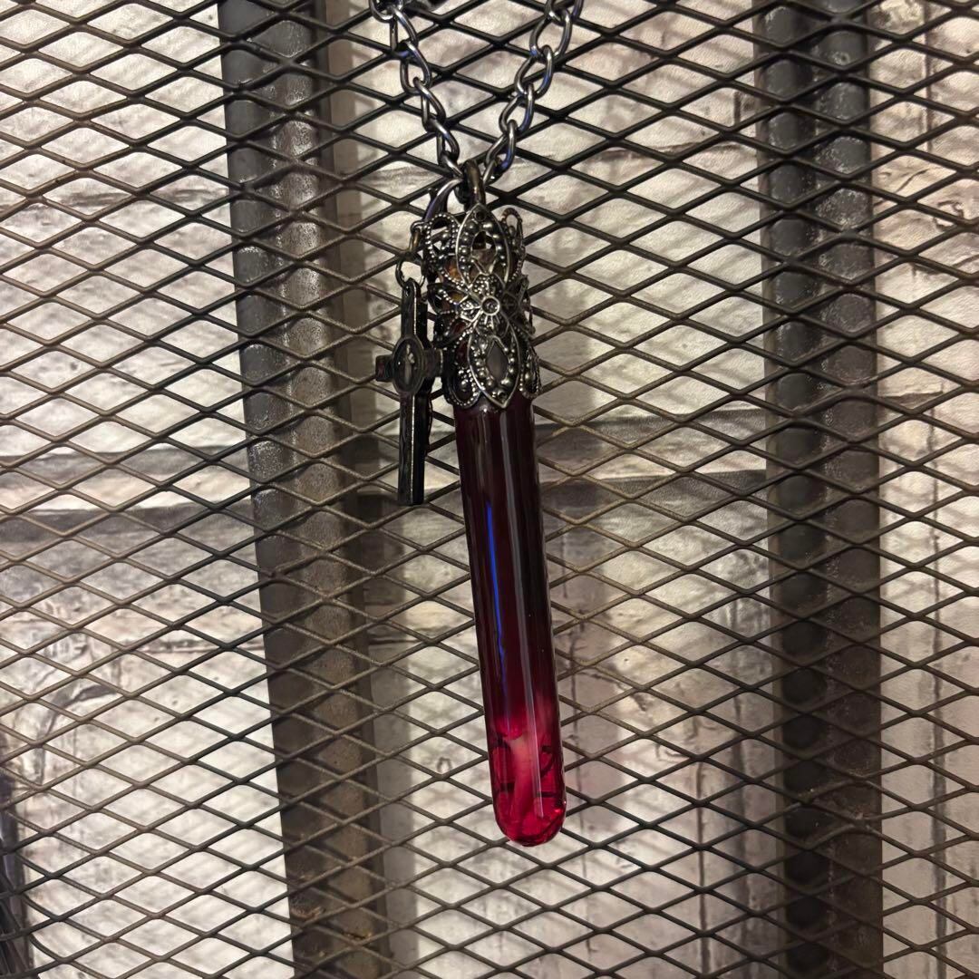 吸血鬼の牙、真紅の血、十字架を組み合わせ吸血鬼を幽閉させたかのようなネックレスになります。