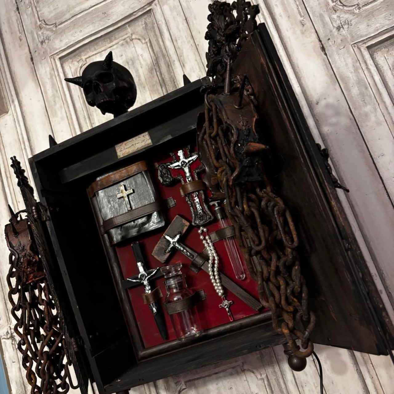 古に伝わる悪魔を滅殺する聖なる加護を受けた道具を開閉式ボックスに納めたオマージュオブジェになります。