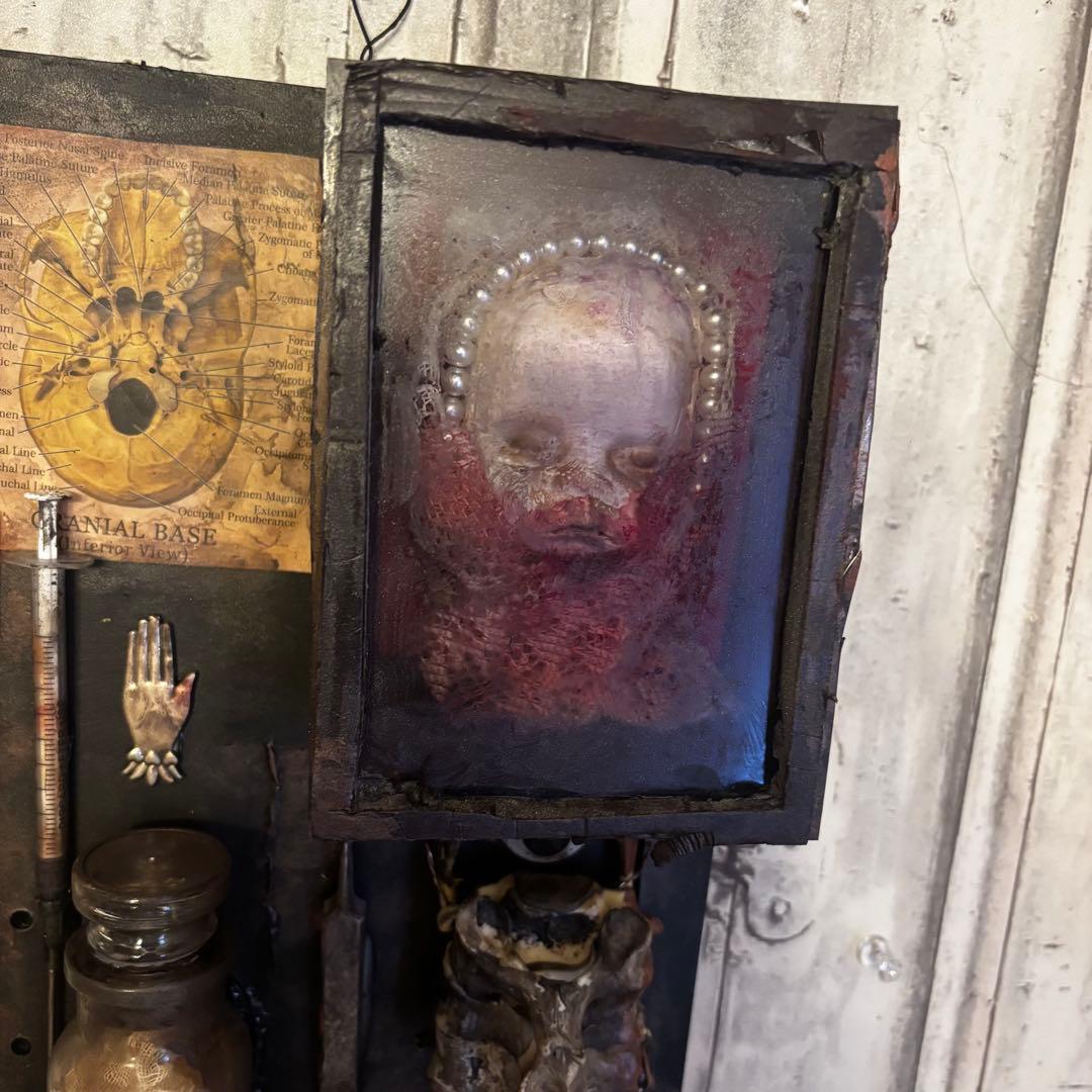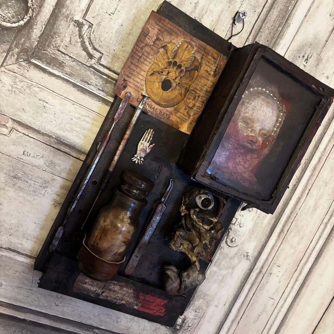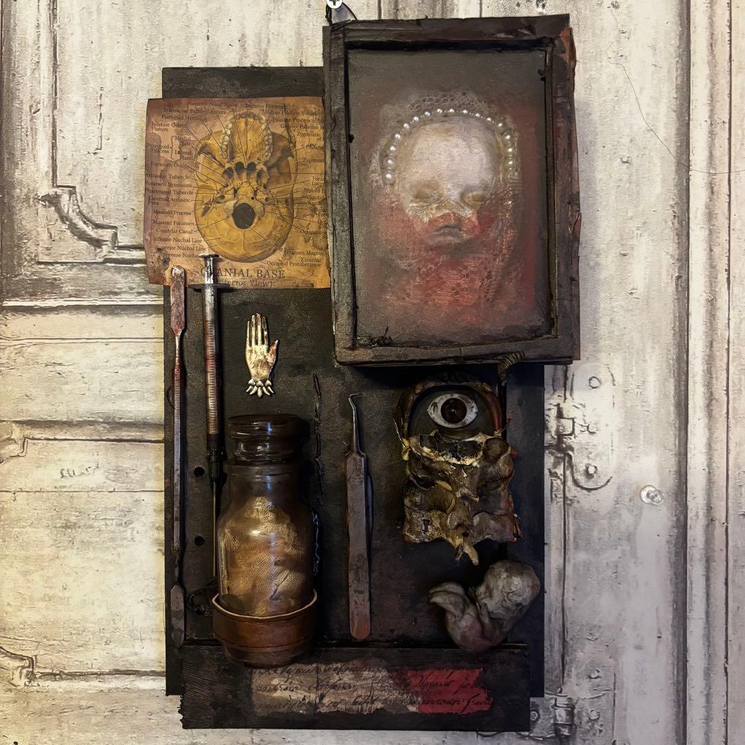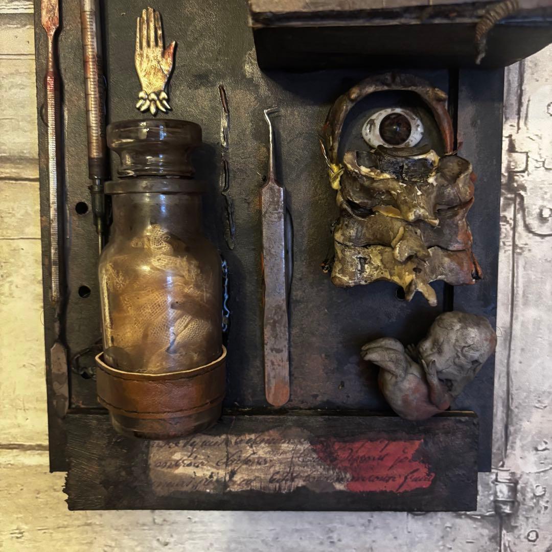 医学書 解剖器具 薬瓶に詰められたガーゼ 骨 少女人形等をアッサンブラージュさせたオブジェになります。