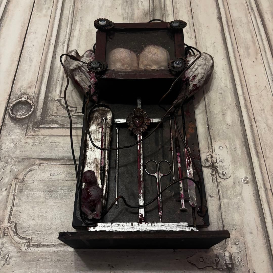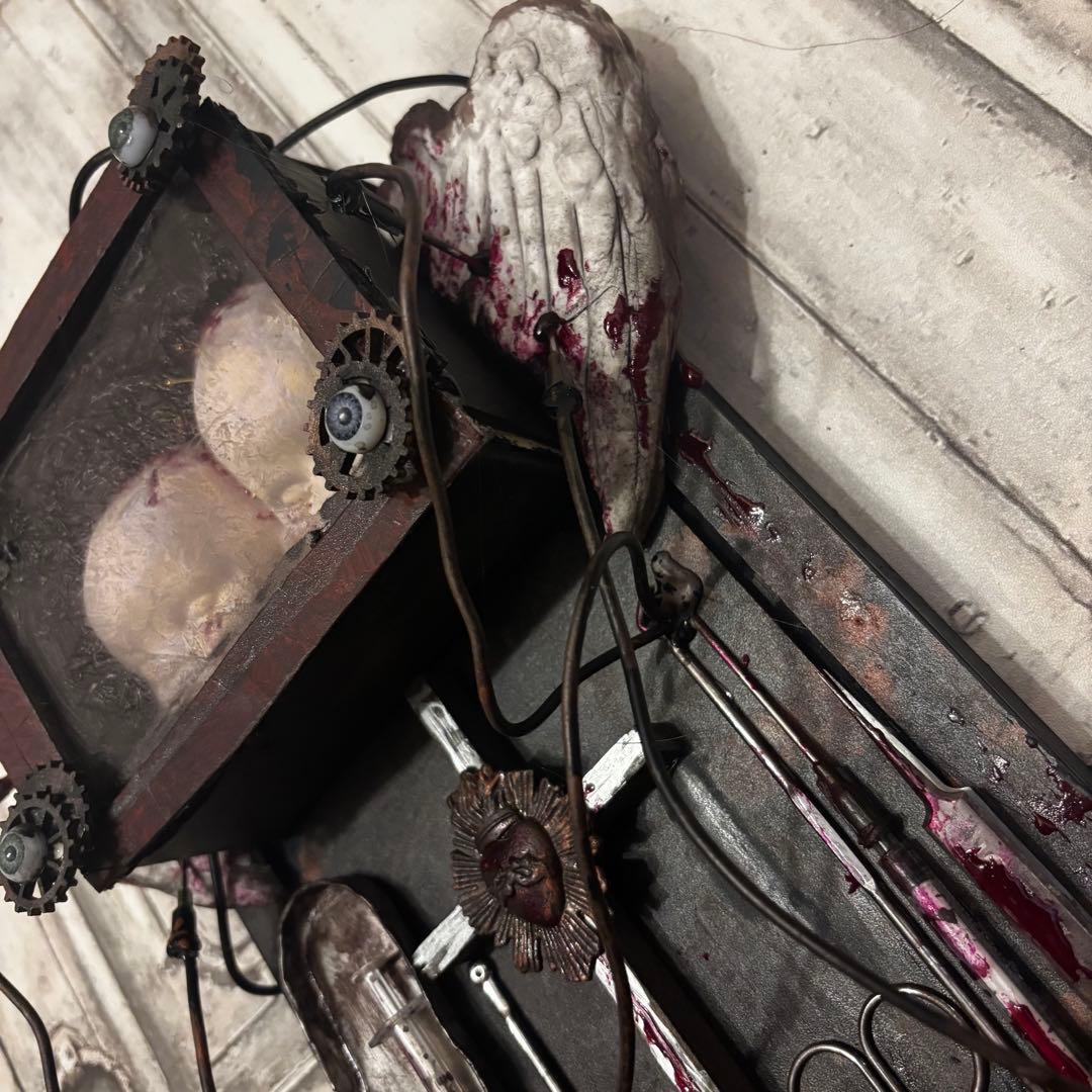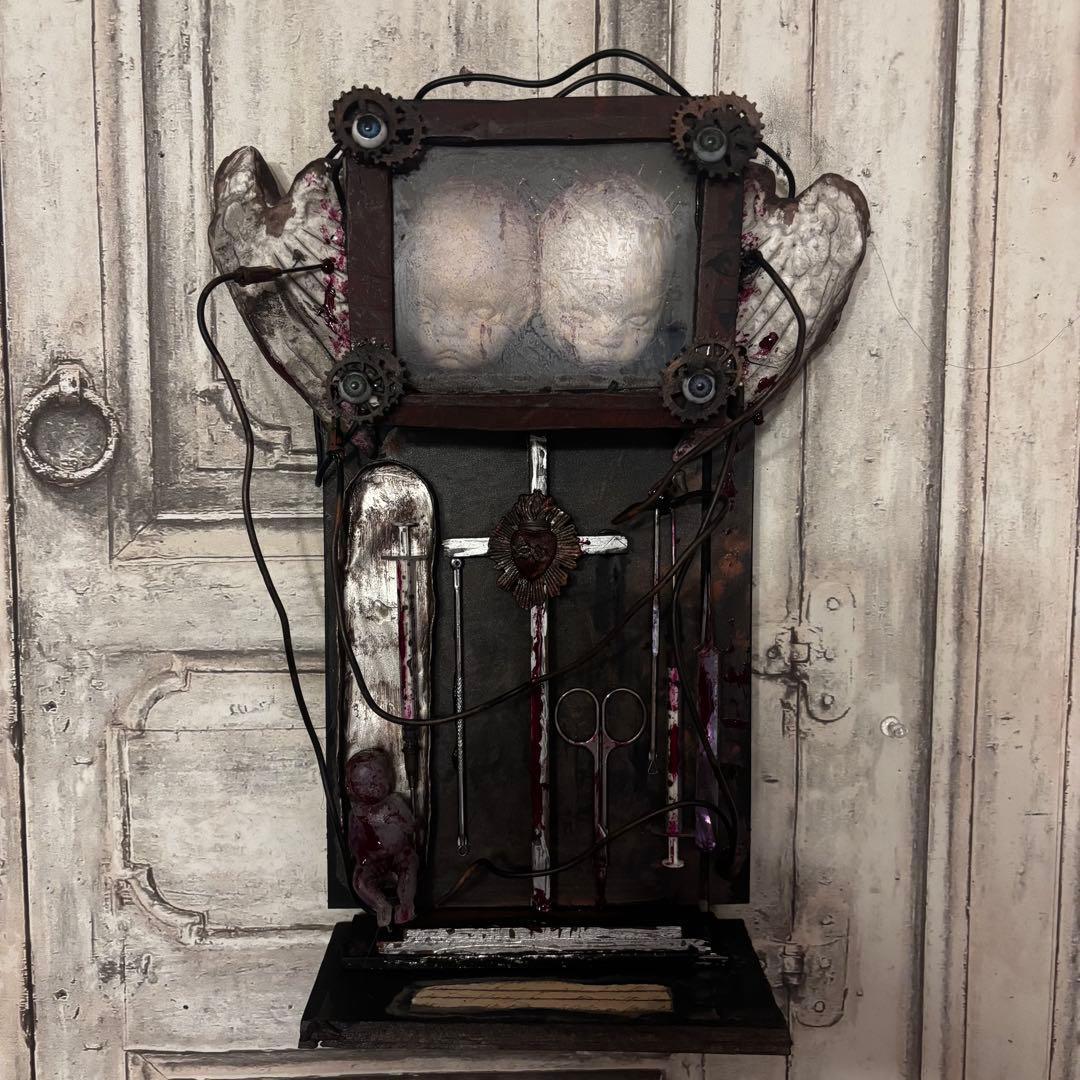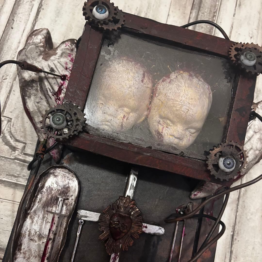 額装された赤子の頭部(ダミー)、血塗られた天使の翼、医療用のハサミやメス、錆びた十字架など、様々な要素が緻密に組み合わされています。配線や金属の歯車がインダストリアルな要素を加え、より複雑で不穏な世界観を構築しています。