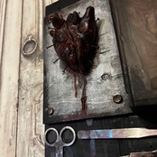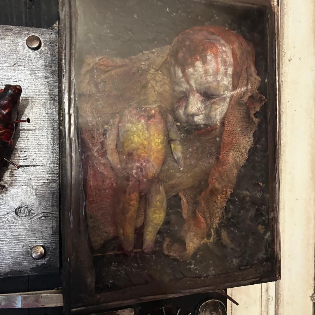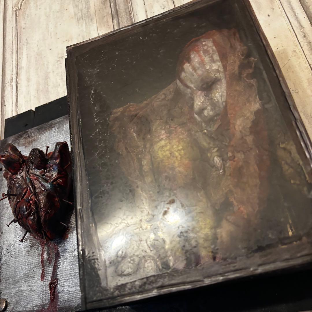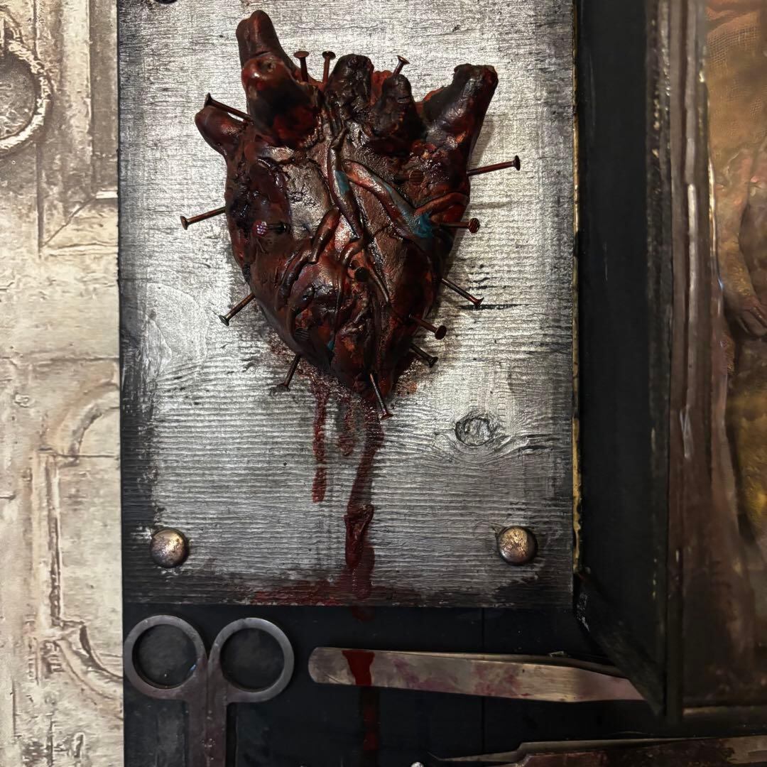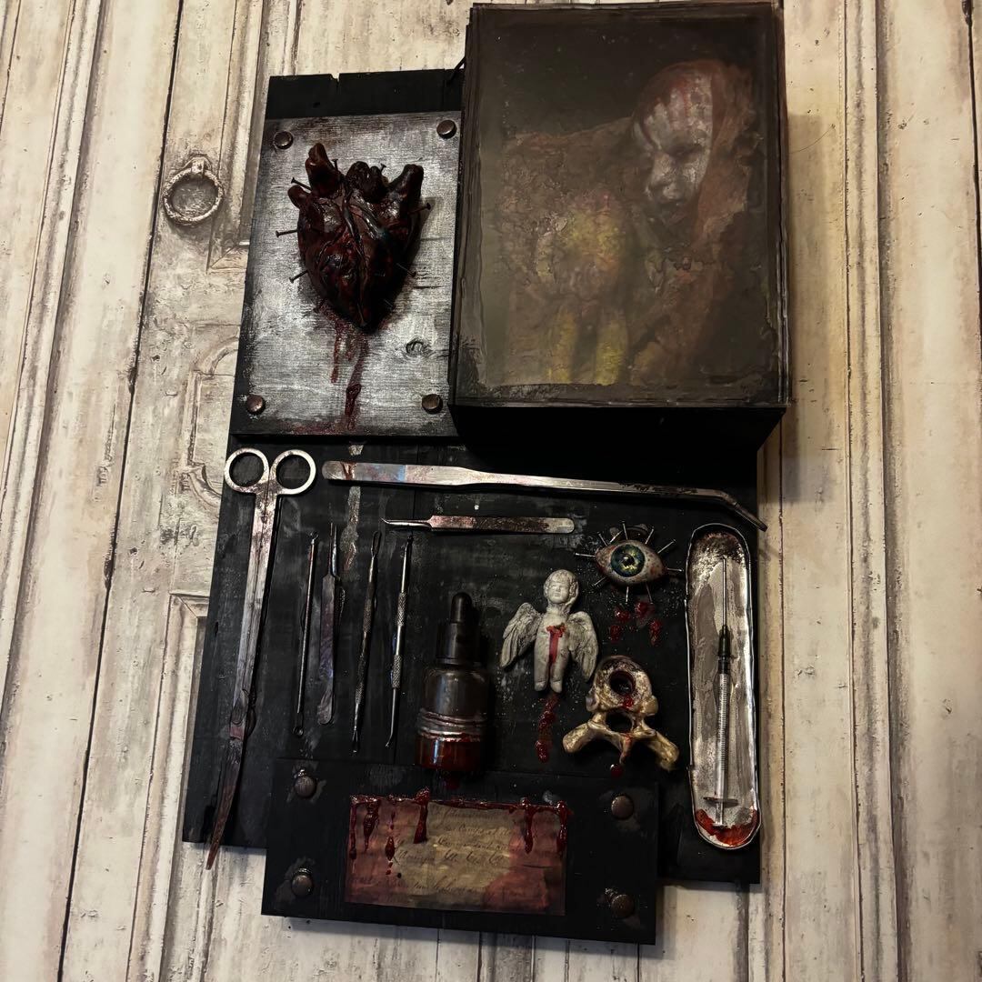 錆びた釘で打ち付けられたような生々しい心臓、包帯に絡み沈む幼子のサンプル、その下には、血痕が残る外科用具と、無垢な天使そして骨や目の残骸が並びます。
