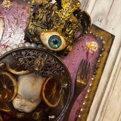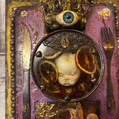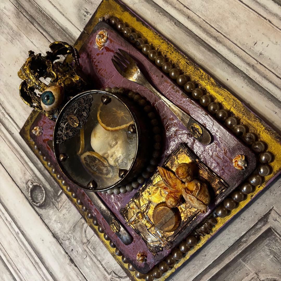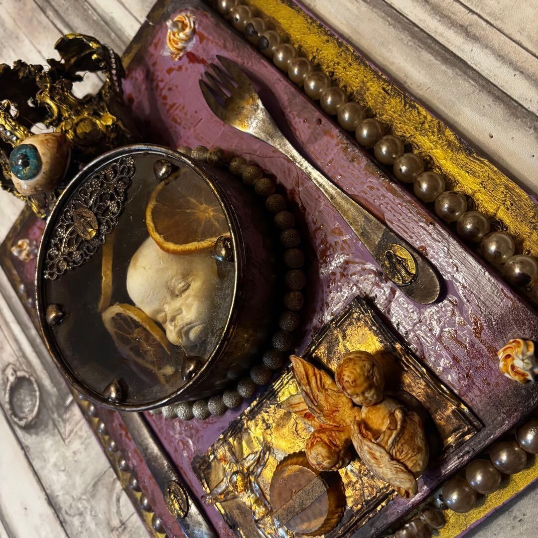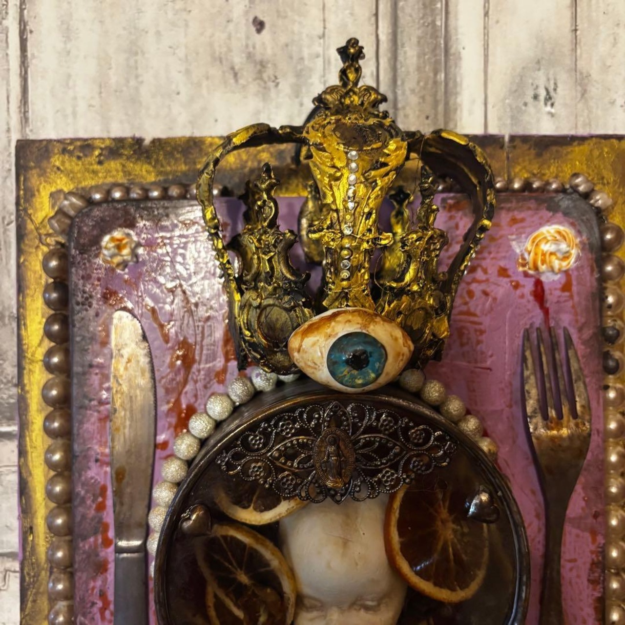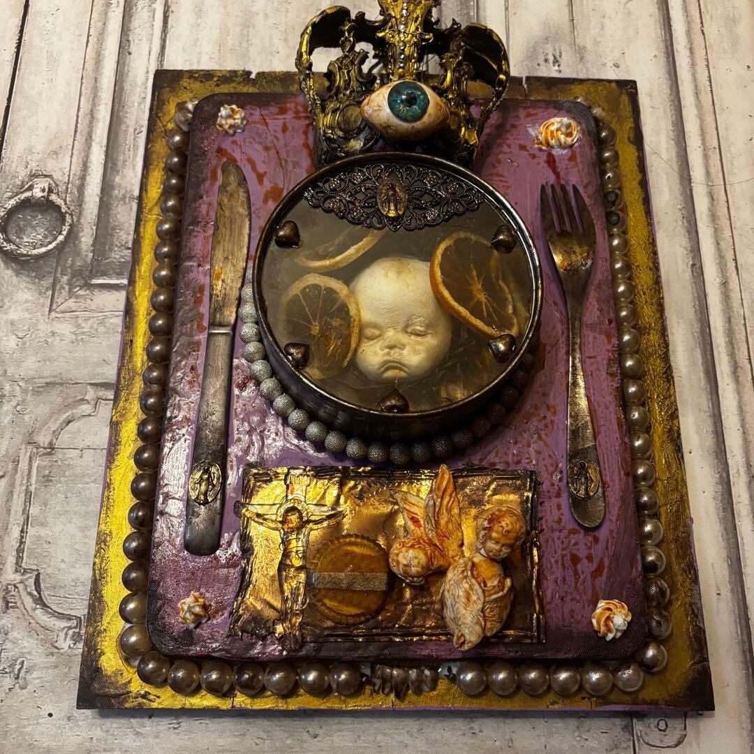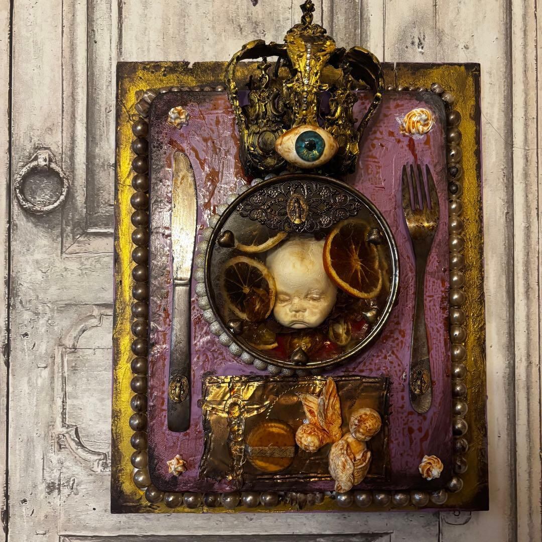 中央には眠る胎児(ドールヘッド)のモチーフが配され、コーティング処理されたドライオレンジやビーズ、古い皿によって、あたかも神聖な供物のように荘厳に囲まれています頂上の王冠と眼球は、権力と監視そして内なる視点を象徴し、作品に深い物語性を与えています。