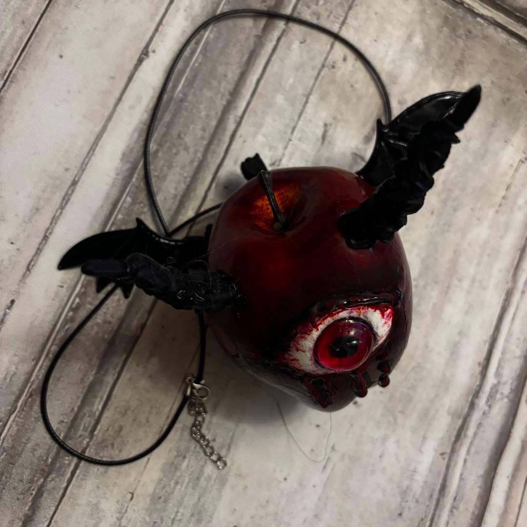 深紅に染まった林檎に、禍々しい魂が宿る。中央に開かれた邪眼は、血の涙を流しながらも全てを見通す力を持つかのよう。漆黒の角と、コウモリのような翼を携えたこのネックレスは異世界世界から抜け出してきた堕天使の果実です。