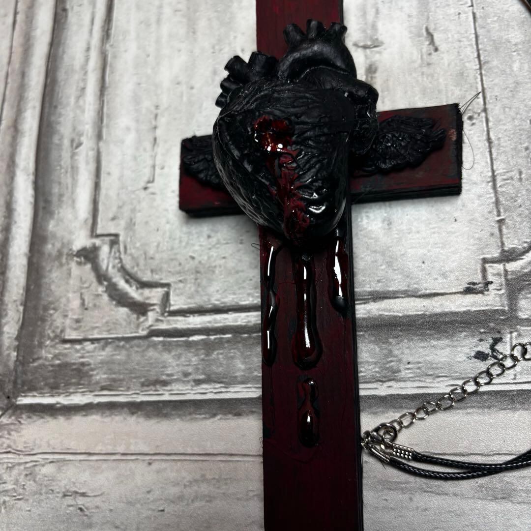 撃ち抜かれた心臓から滴り落ちる聖なる血を掲げた十字架ネックレスです。