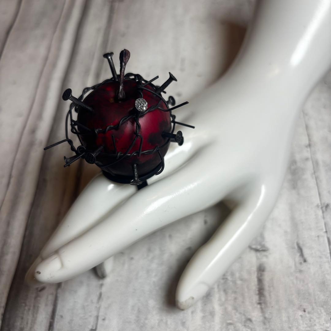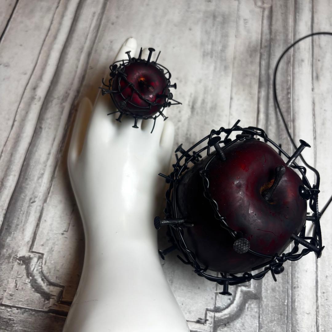 リアルな作りの林檎に錆び付いた杭が貫通し鉄線に巻かれていてインパクトあるネックレス+リングのセットになります。