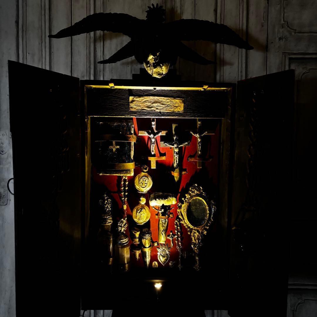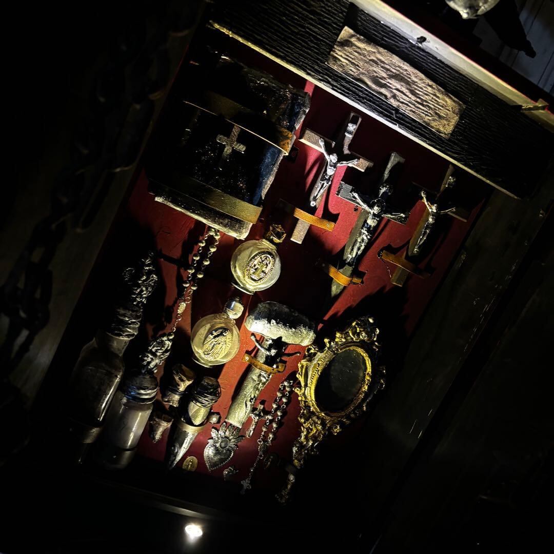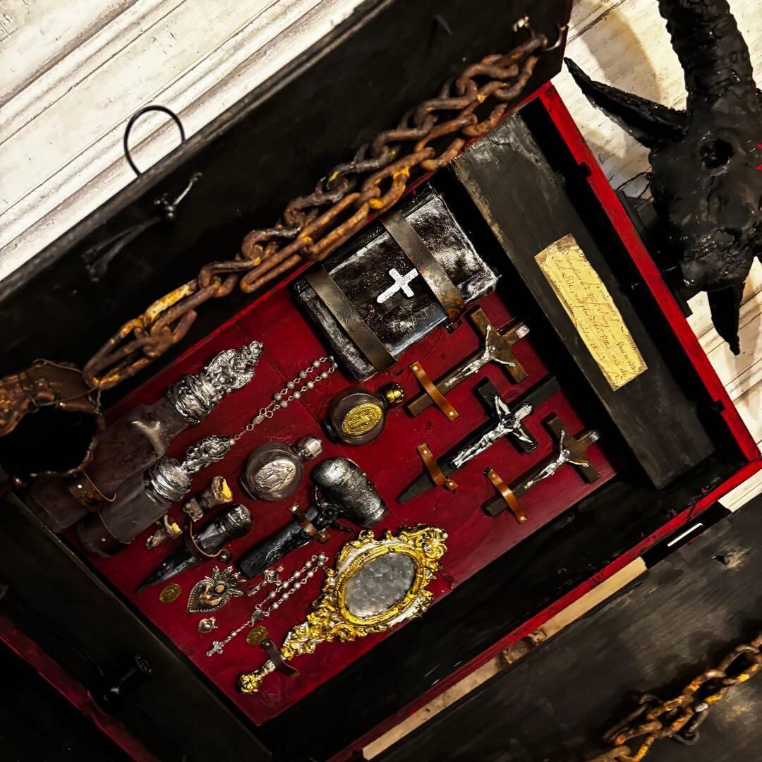 古に伝わる悪魔を滅殺する聖なる加護を受けた道具を開閉式ボックスに納めたオマージュオブジェになります。