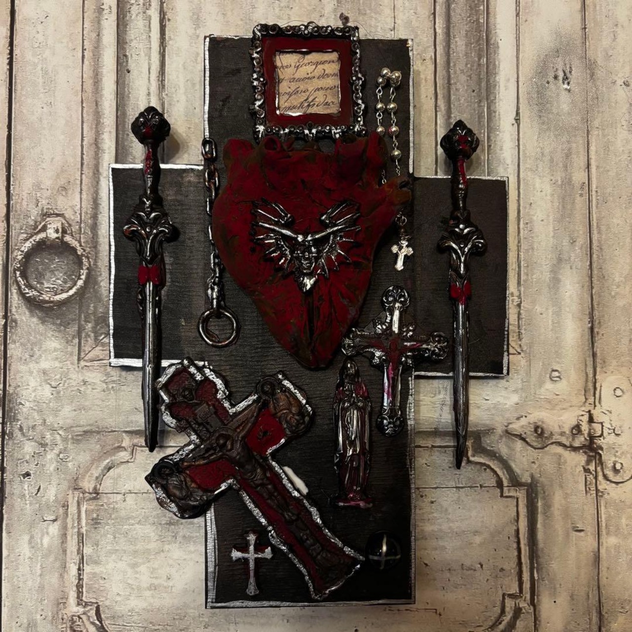 古びた扉のような背景に、年月を経てなお色褪せない信仰と、内に秘めた狂気を表現しています。