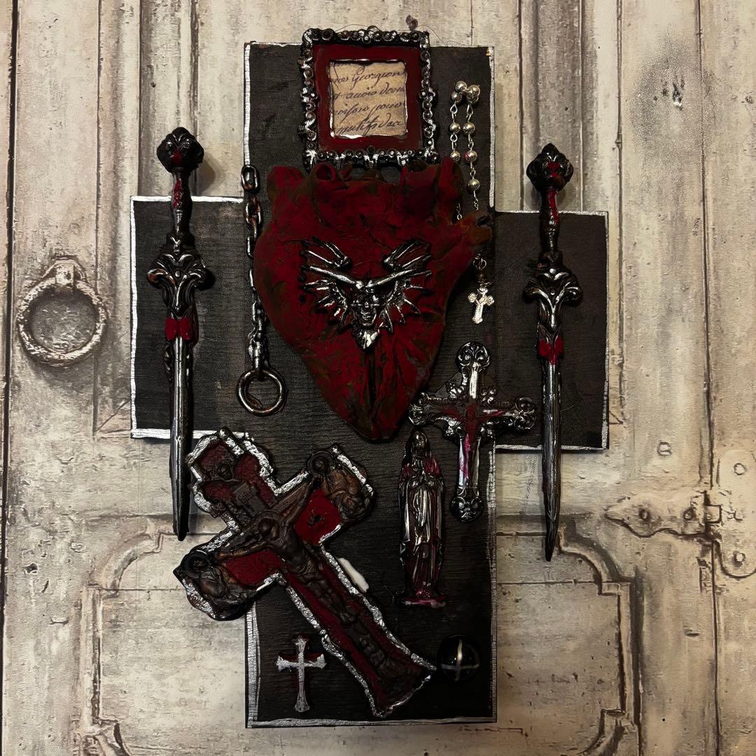 中央に鎮座する真紅の心臓(コラソン)と、それを取り囲む重厚なダガー(短剣)。宗教的な荘厳さと、ゴシックな闇が融合したデザインです。
