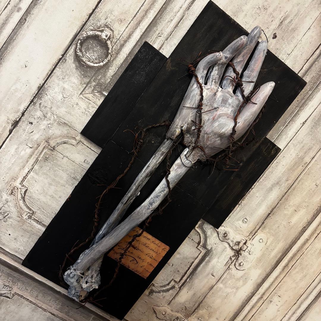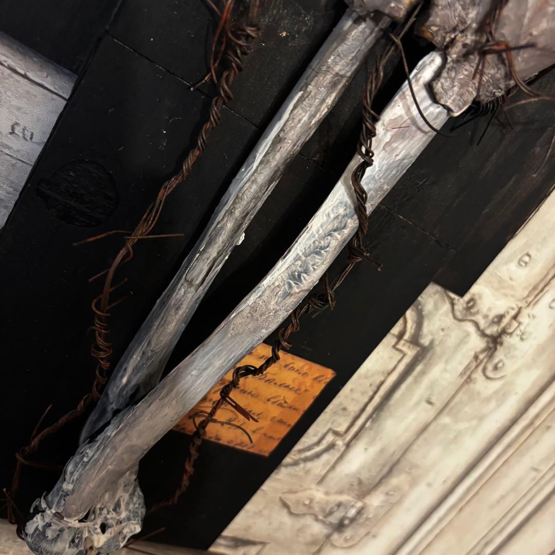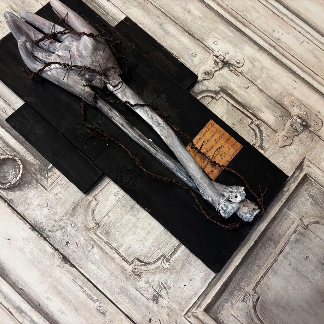 朽ち果てた骨の質感と、それを縛り付ける有刺鉄線。黒く煤けたような十字架のベースが、静謐(せいひつ)ながらも重厚な存在感を放つ一点物の壁掛けオブジェです。