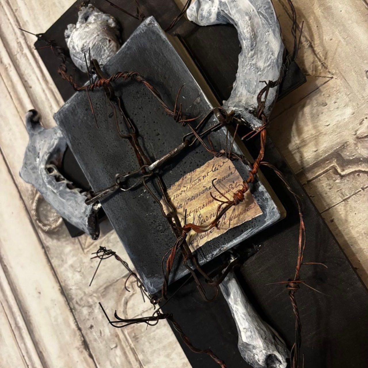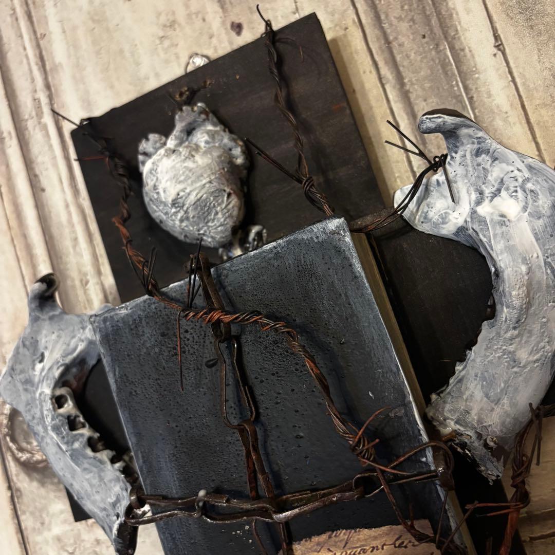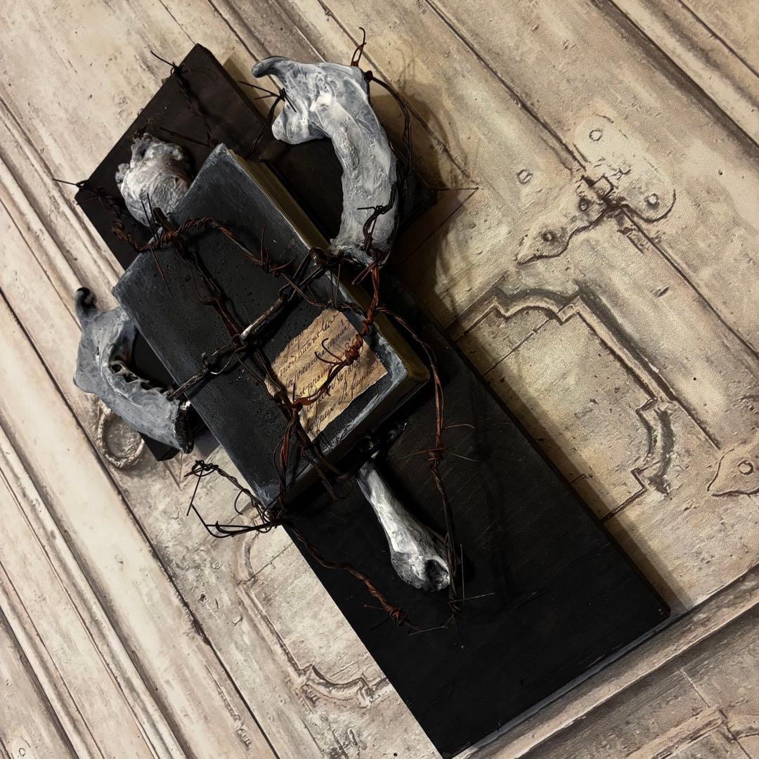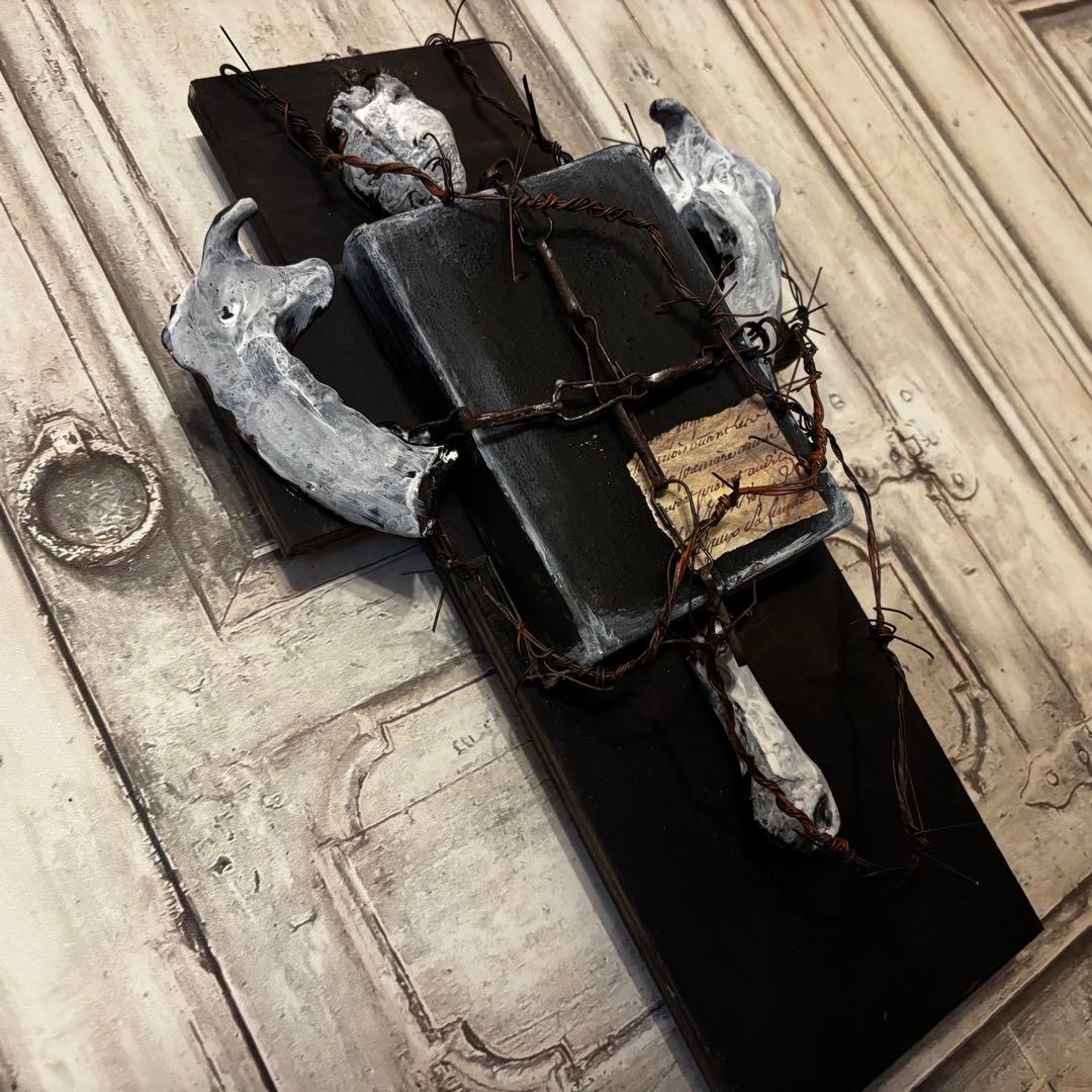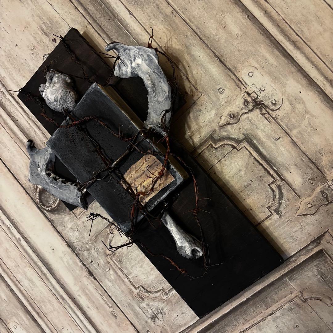 黒い十字架をベースに、古びた聖典、心臓、そして獣の顎骨(あごぼね)を想起させるパーツを配置し、有刺鉄線で幾重にも縛り付けた背徳的な美しさを放つ作品です。