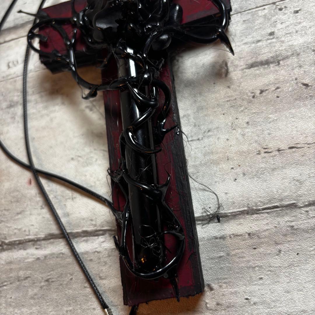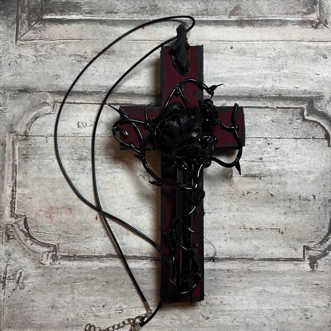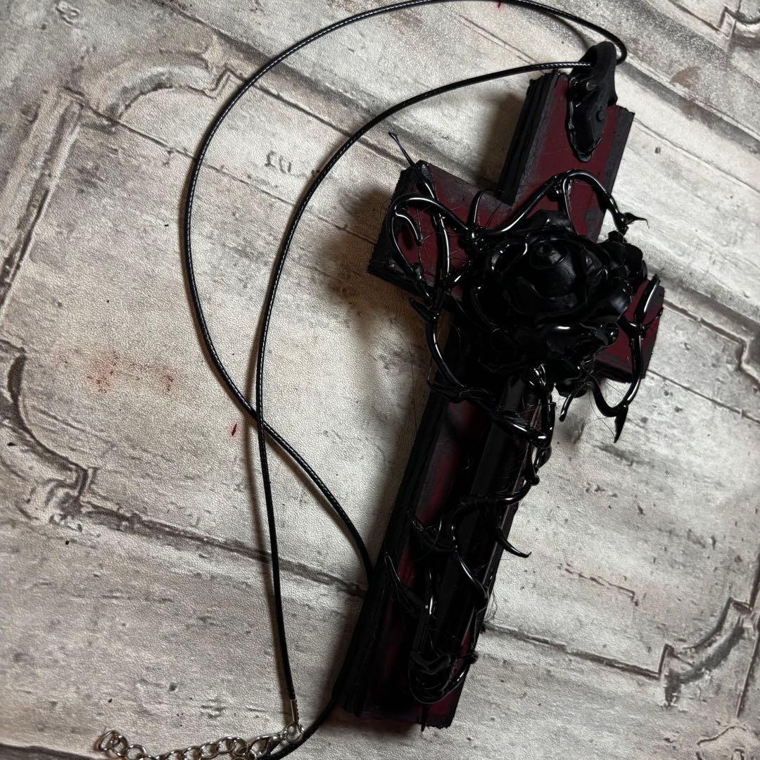 漆黒の薔薇と、滴る血を彷彿とさせる意匠が施された十字架ネックレスです。