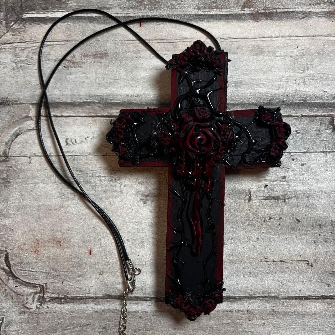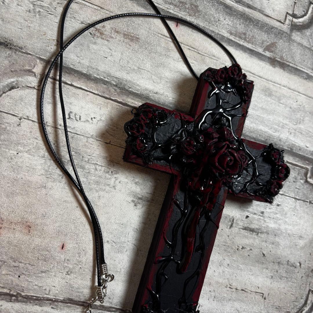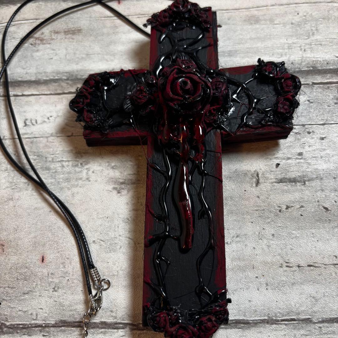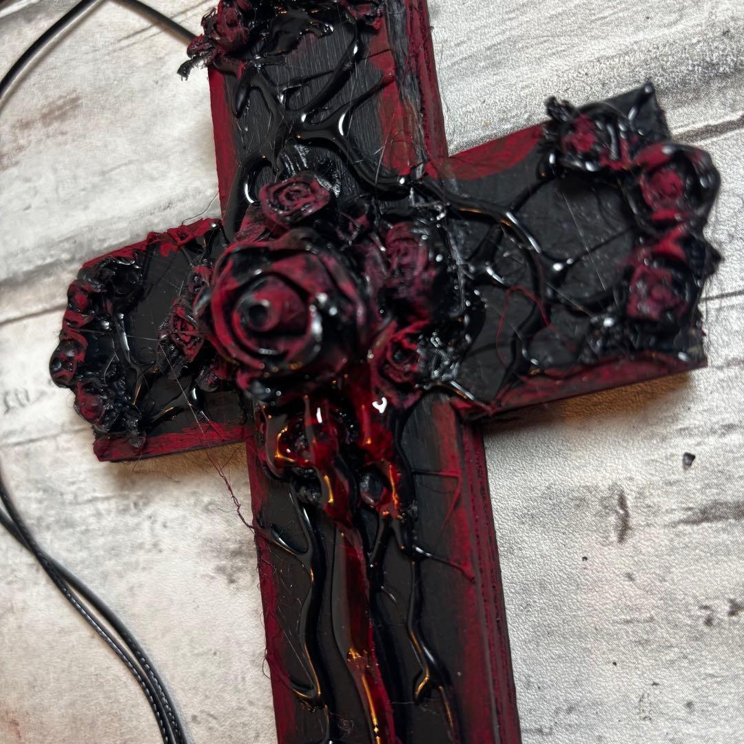 重厚感のある黒い十字架に、絡みつくような蔓と艶やかな黒薔薇、そして中央からは鮮烈な赤が滴る、非常に退廃的で美しいデザインに仕上げられています。