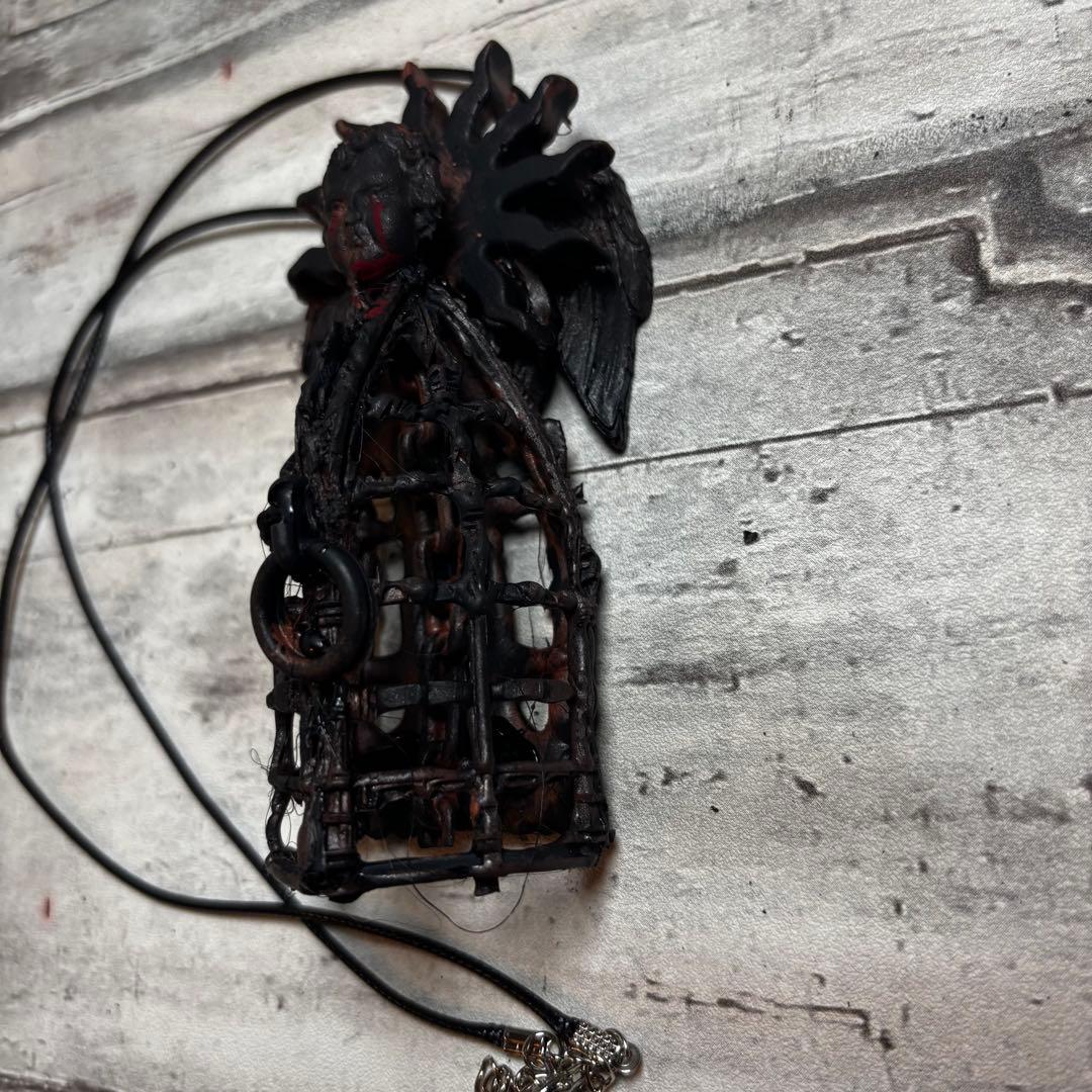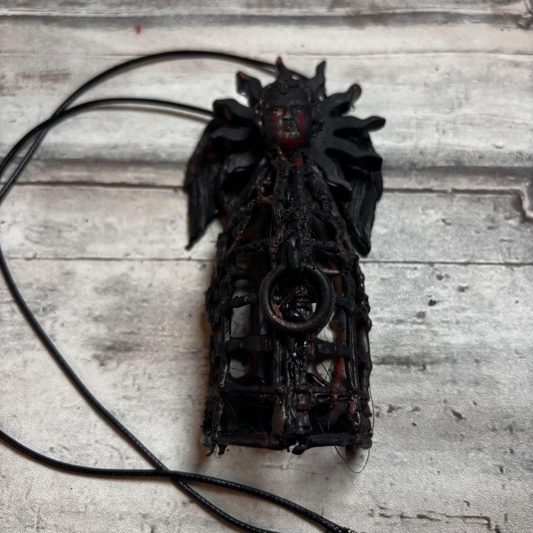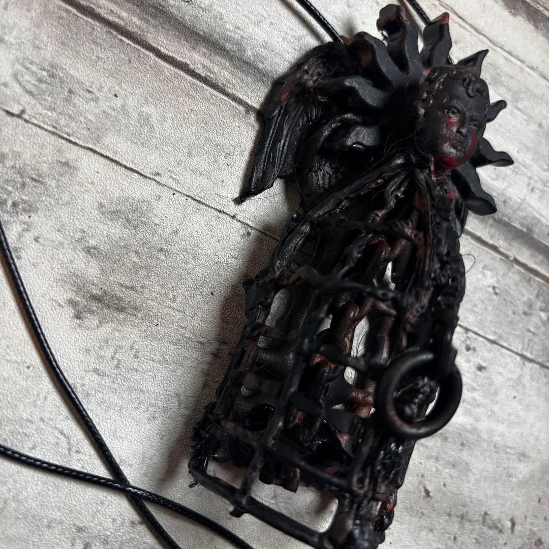 籠の中に閉じ込められたようなデザインと、血を流しているかのような表情の天使、そしてそれを取り囲む光輪が、神聖さと残酷さを同時に表現しています。