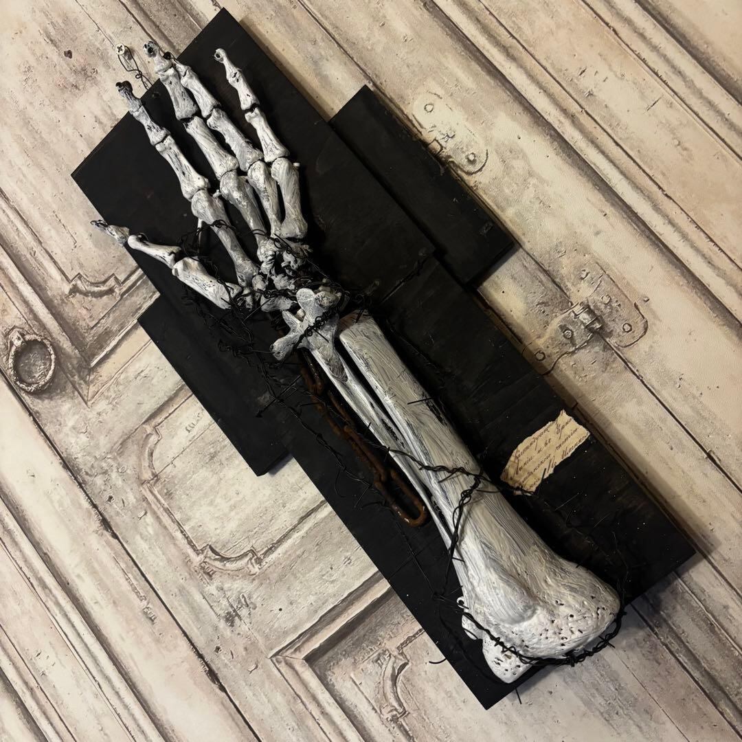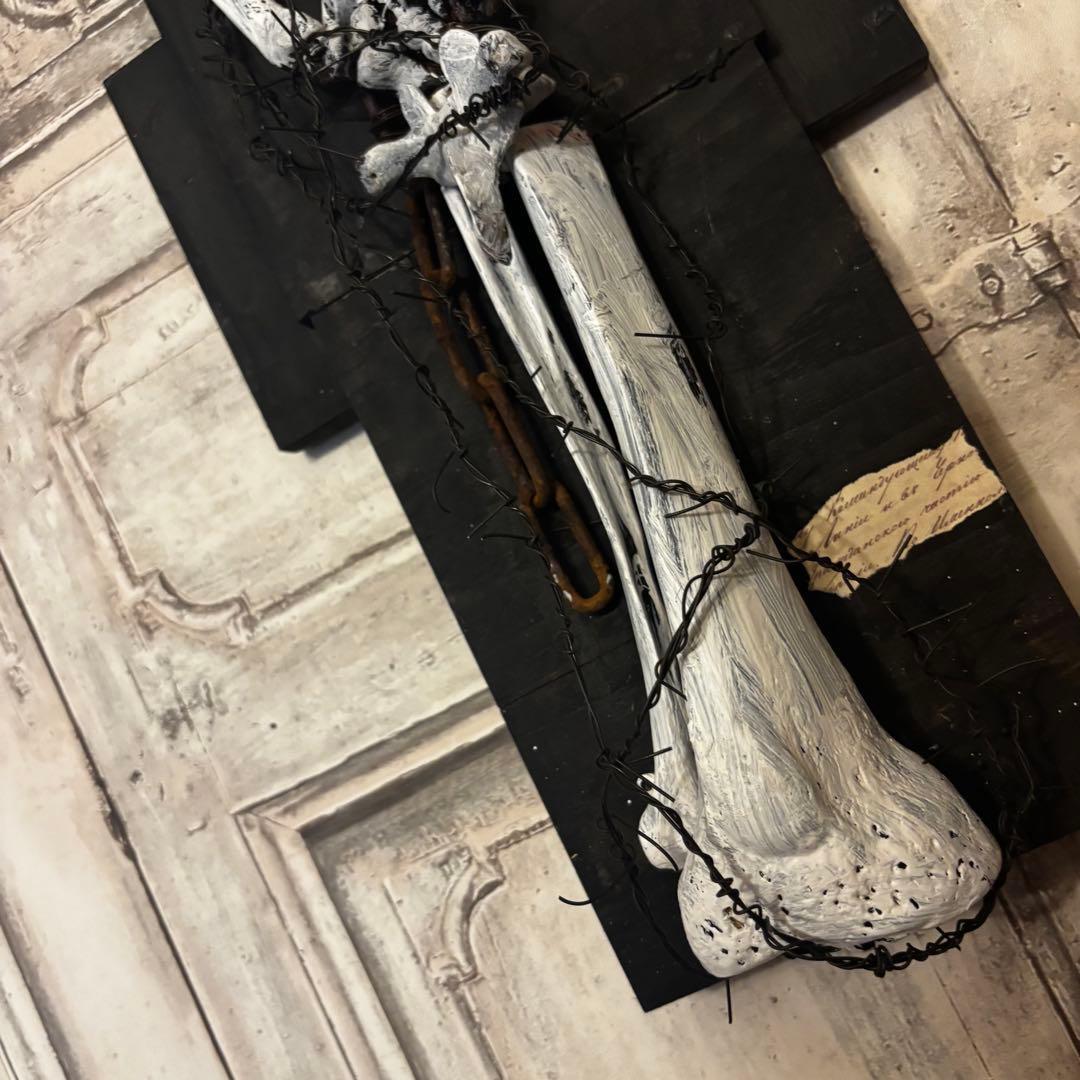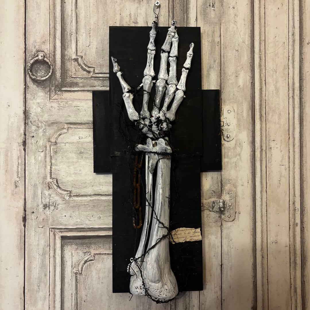 白骨化した「手」が、黒く煤けた十字の木製ベースに、錆びた鉄鎖と有刺鉄線によって封じ込められた「沈黙の祈り」を表現しています。単なる装飾品ではなく、そこにある種の「物語」を感じさせる重厚な佇まいを目指しました。
