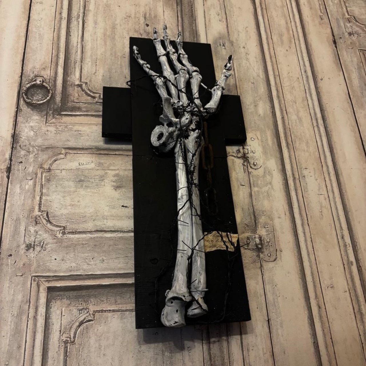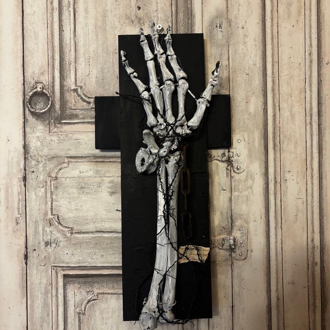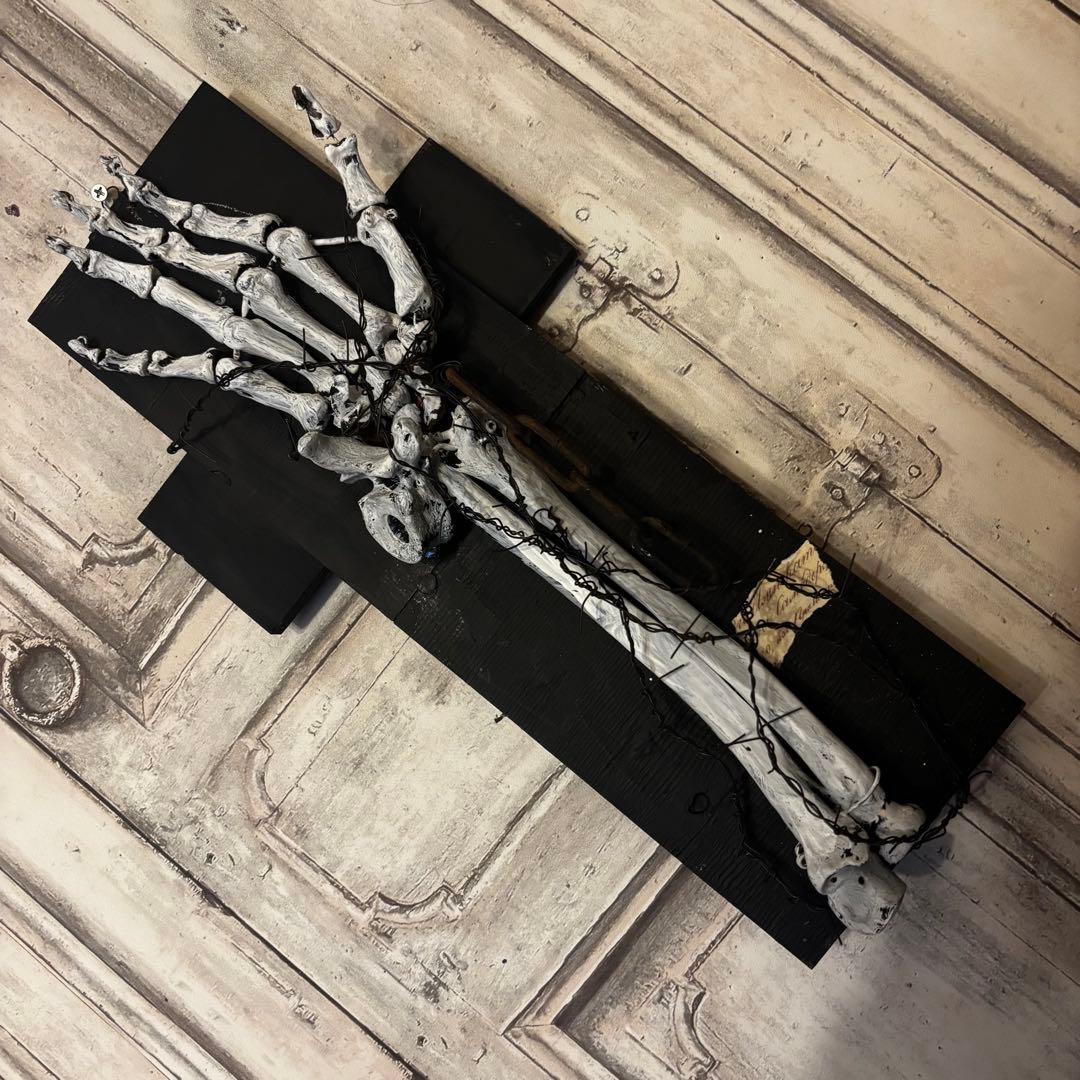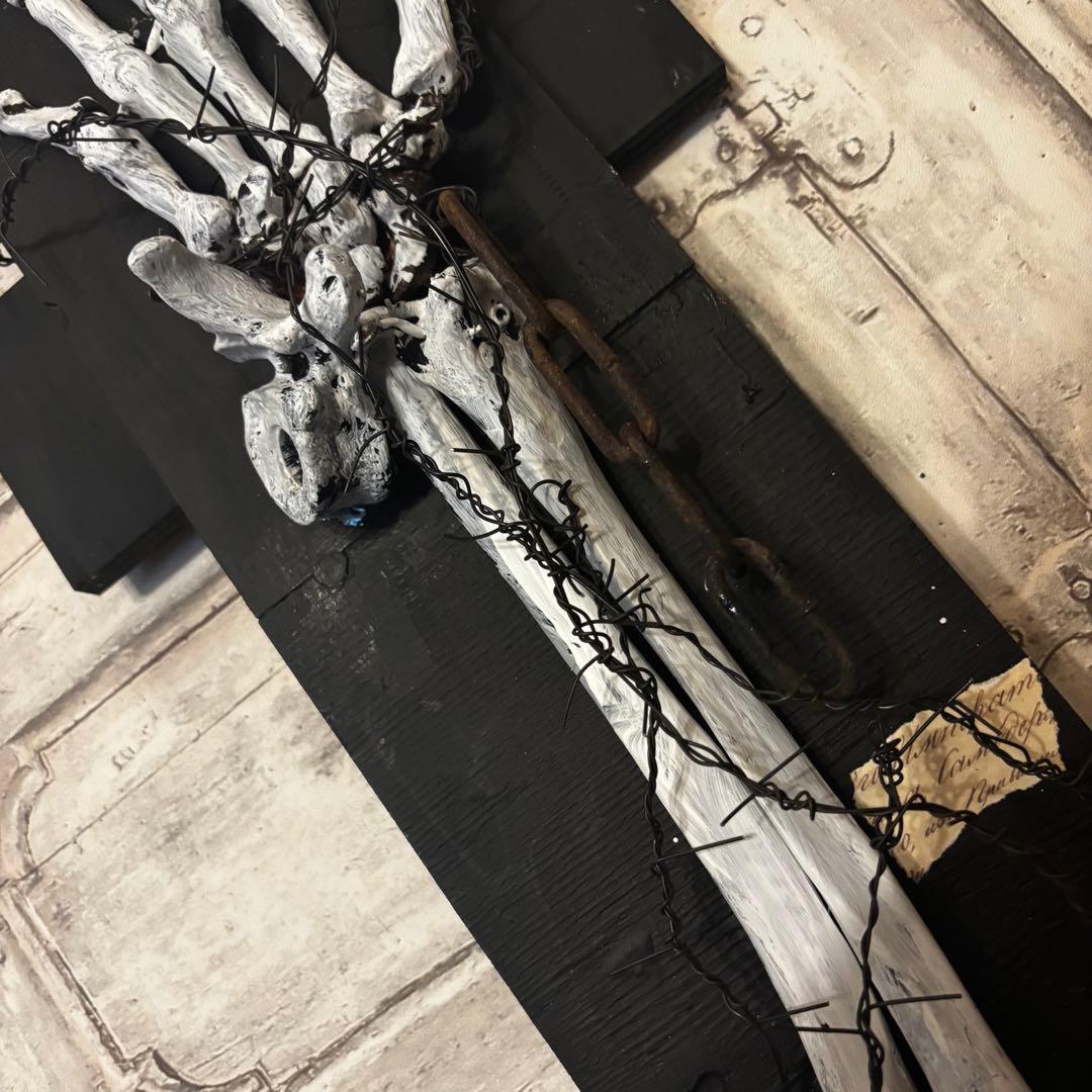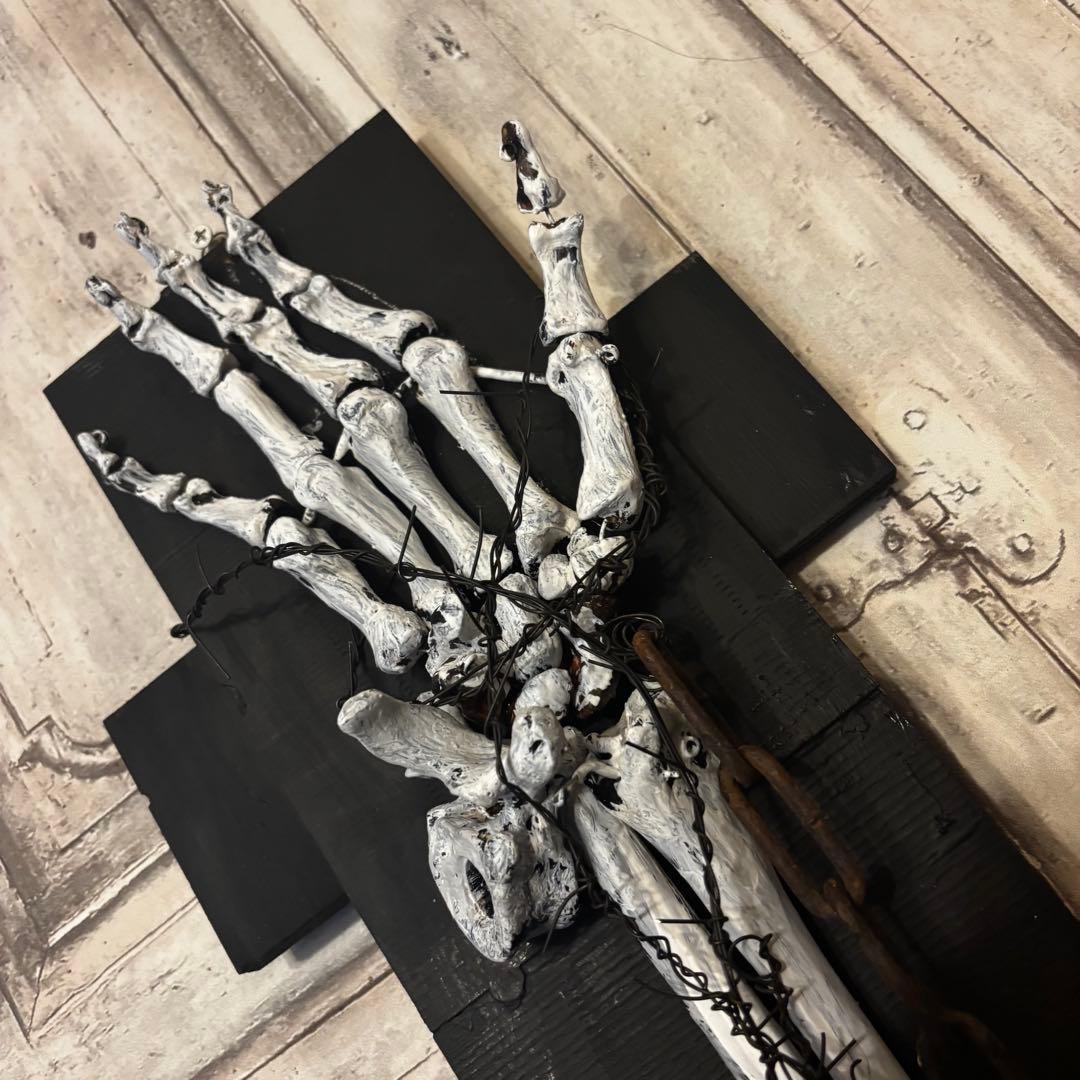 白骨化した「手」が、黒く煤けた十字の木製ベースに、錆びた鉄鎖と有刺鉄線によって封じ込められた「沈黙の祈り」を表現しています。単なる装飾品ではなく、そこにある種の「物語」を感じさせる重厚な佇まいを目指しました。