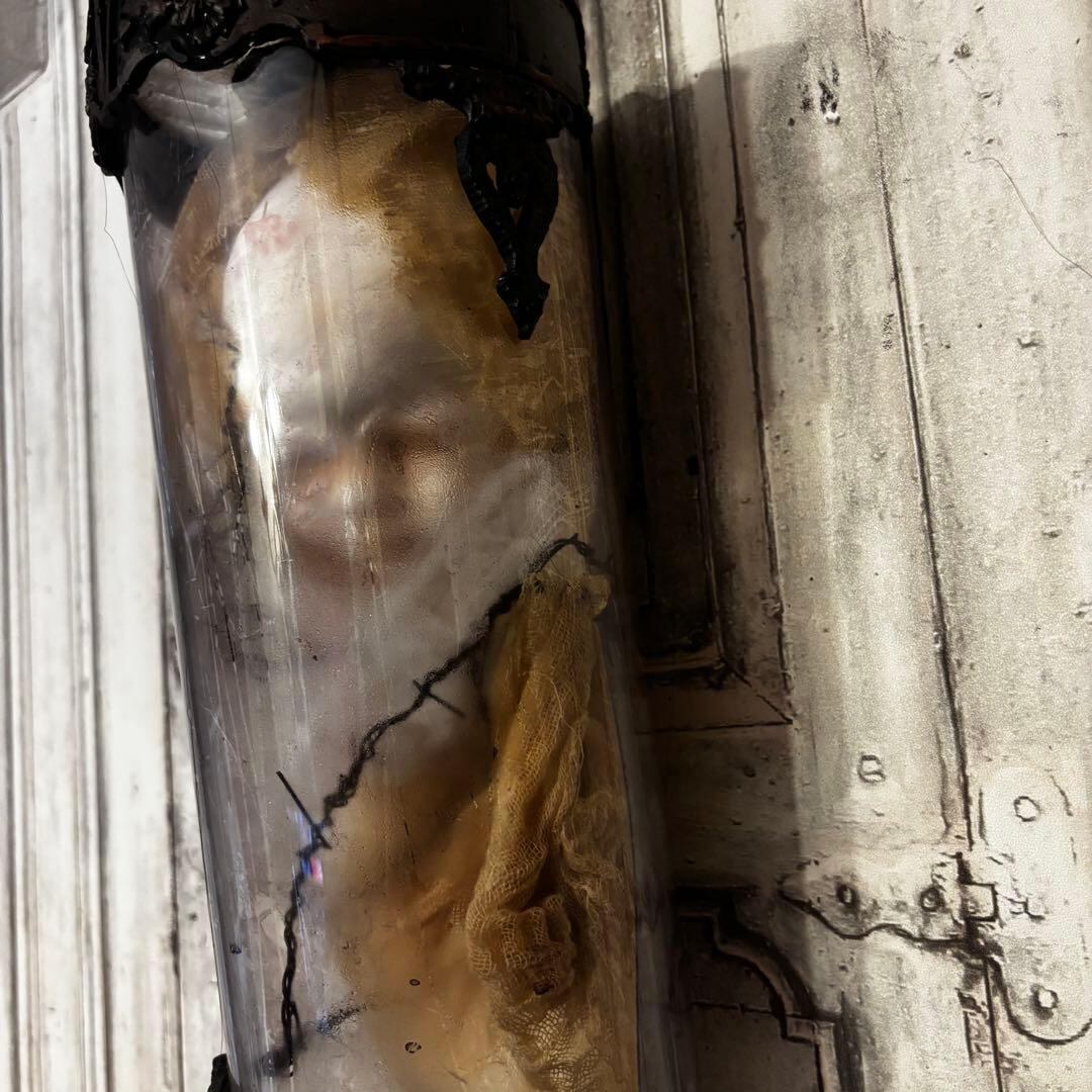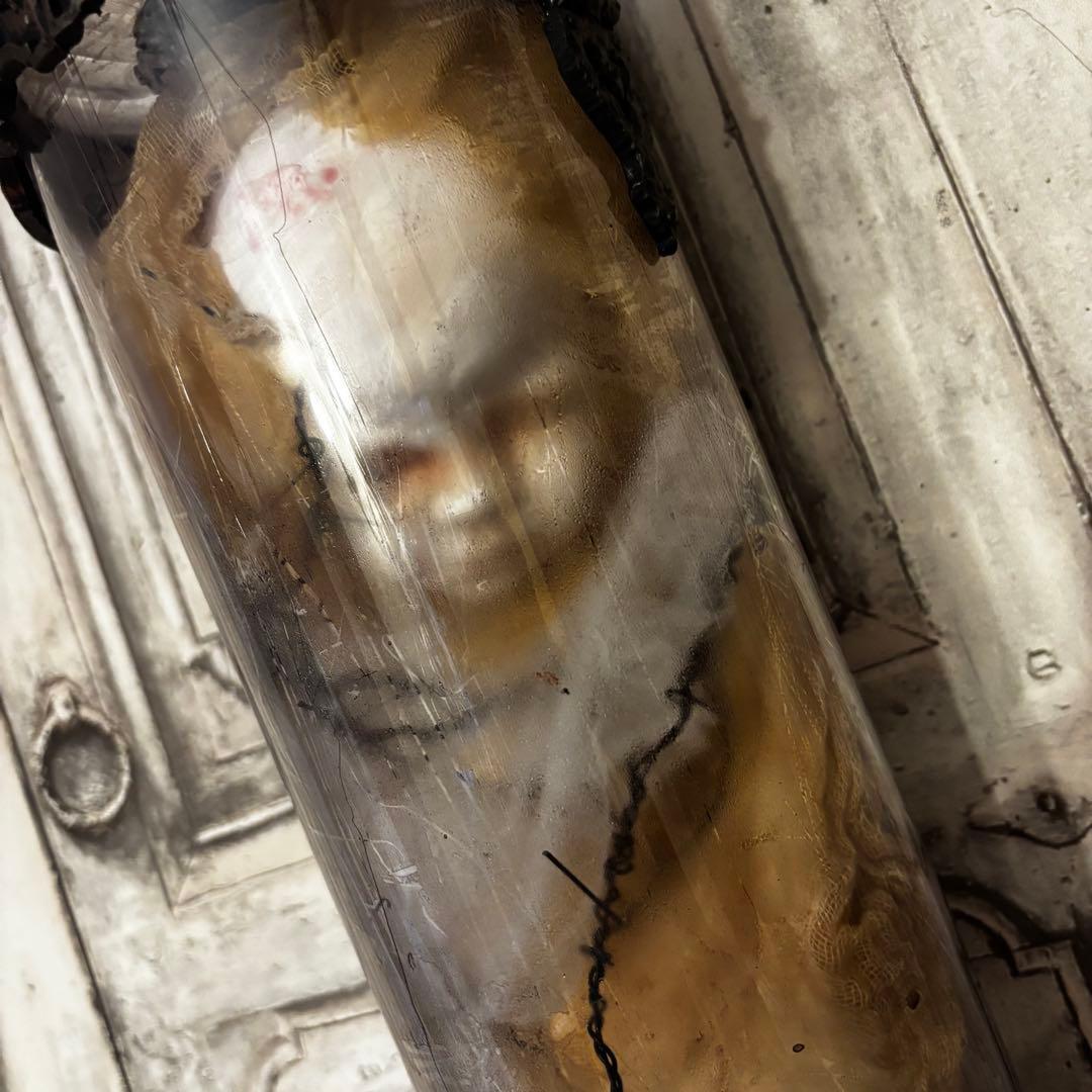 円筒形のアクリルケースに封じ込められた、静かなる叫びを湛える天使の頭部。