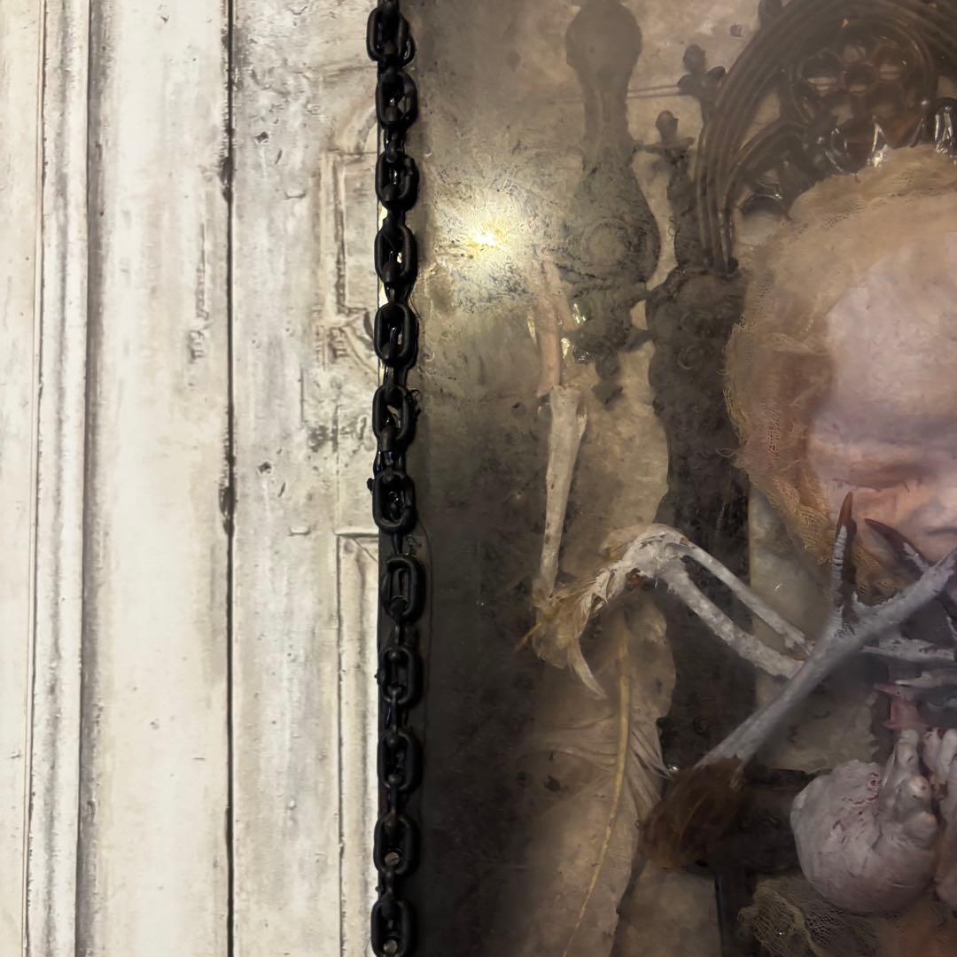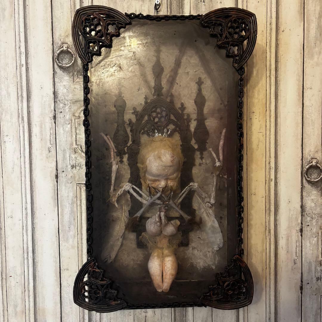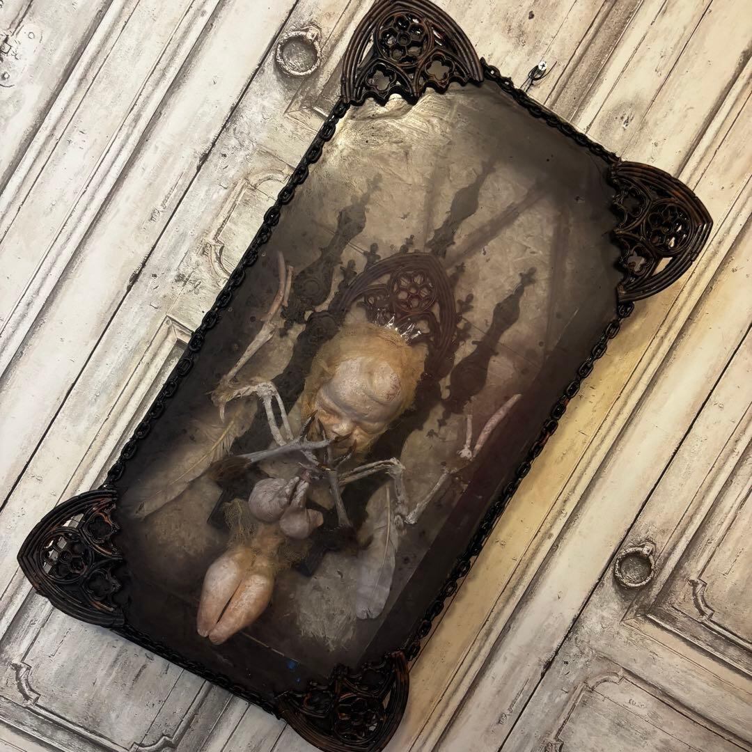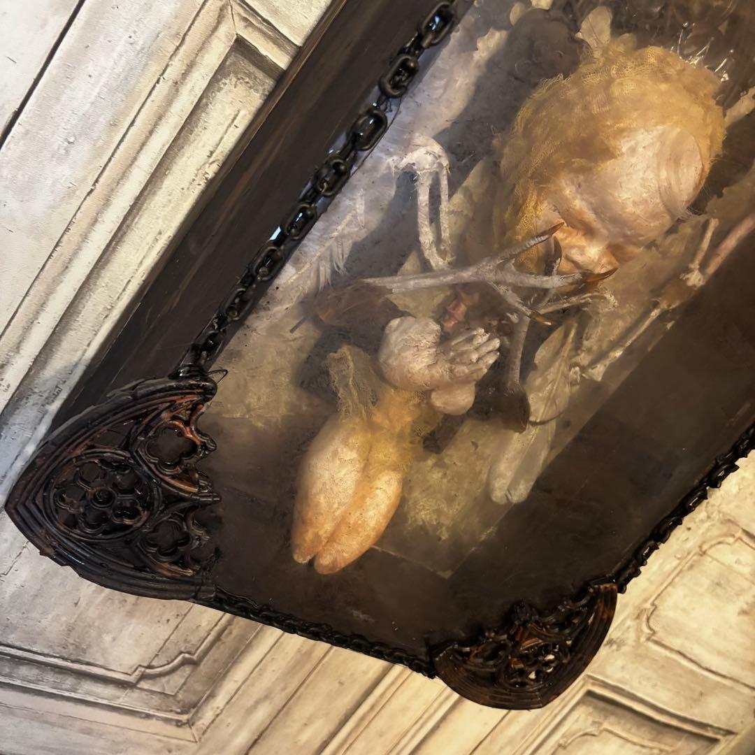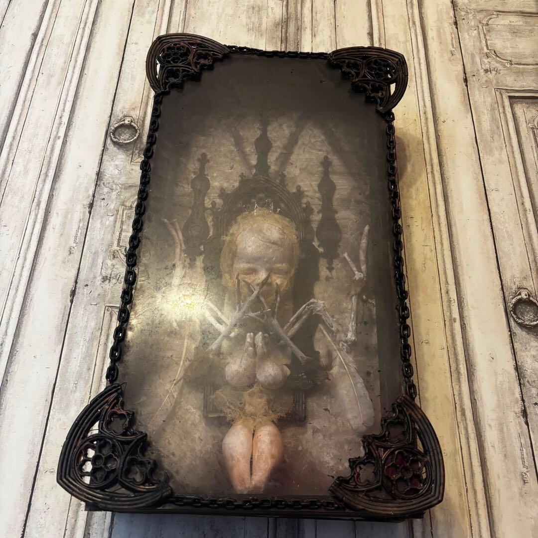 こちらの作品は、退廃的な美しさと神聖さが同居する、唯一無二のオブジェです。ゴシック様式の祭壇を思わせる装飾フレームの中に、静寂に包まれた「天使」を閉じ込めました。