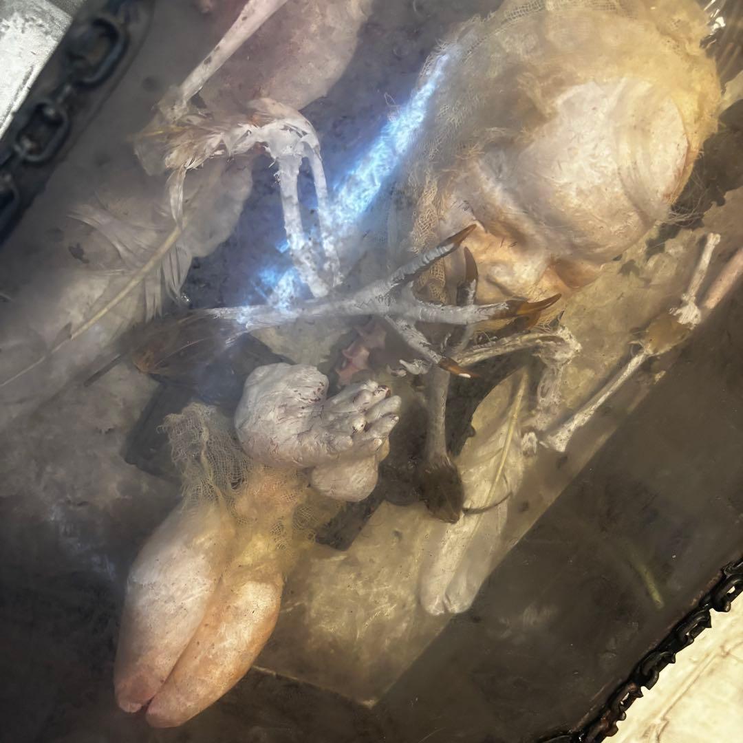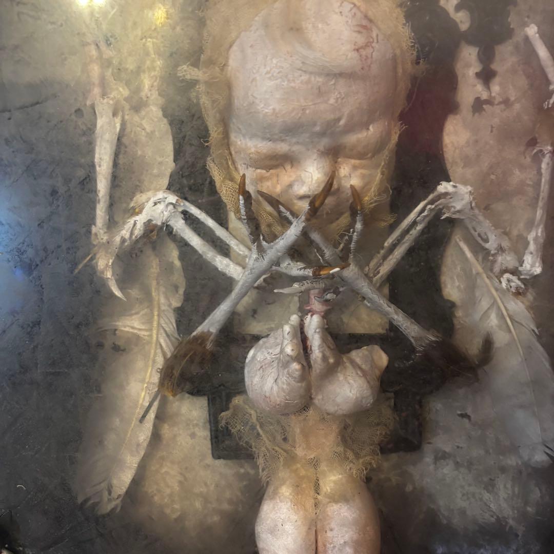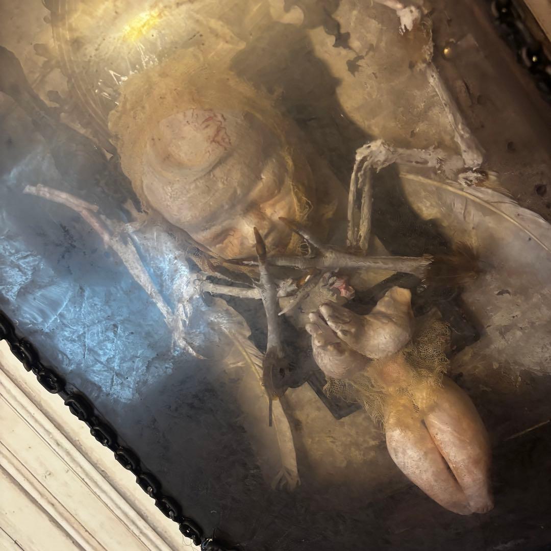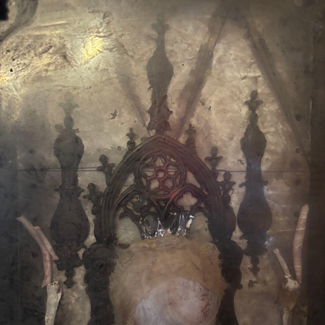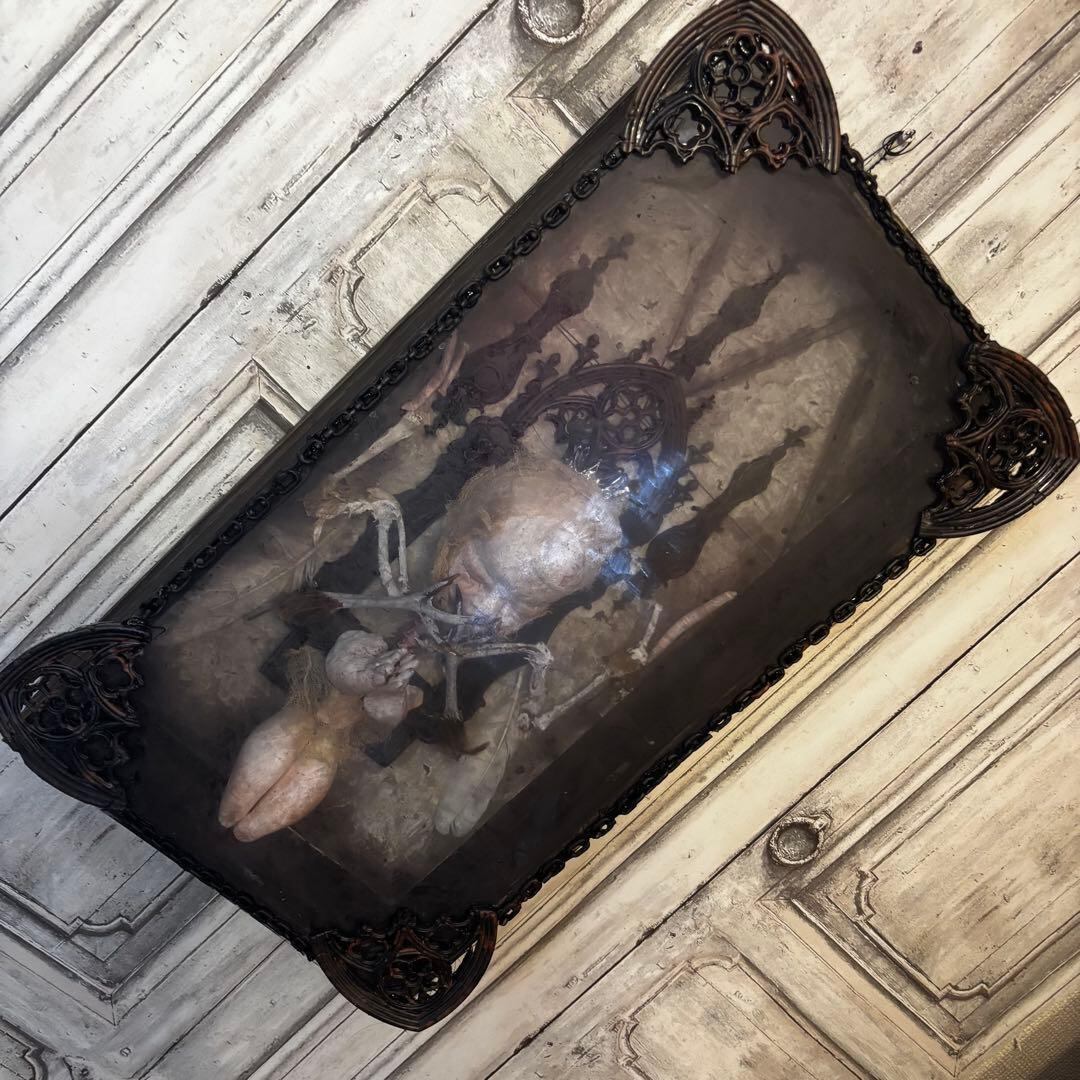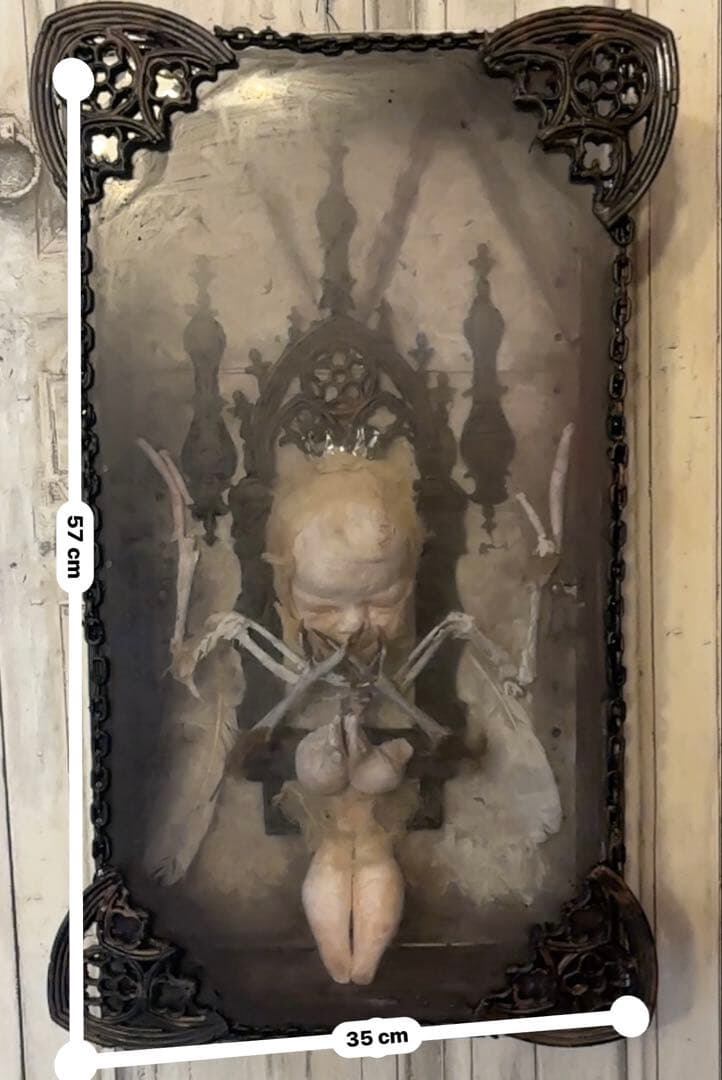こちらの作品は、退廃的な美しさと神聖さが同居する、唯一無二のオブジェです。ゴシック様式の祭壇を思わせる装飾フレームの中に、静寂に包まれた「天使」を閉じ込めました。